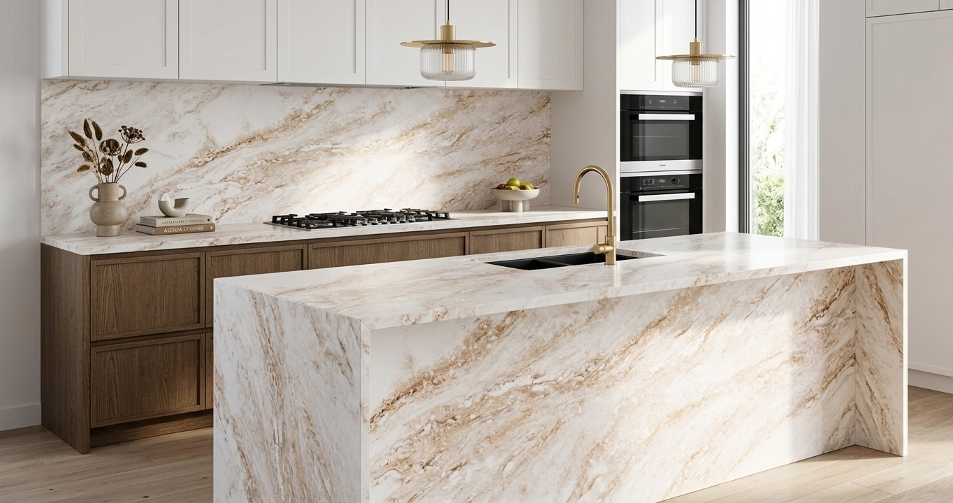 Grand Canyon evokes the layered textures and earthy richness of a natural canyon, with sweeping diagonal veins of amber, rust, and soft taupe over a creamy white background. The warm undertones and fluid movement across the slab create a bold yet elegant look that can complement both traditional and modern spaces.