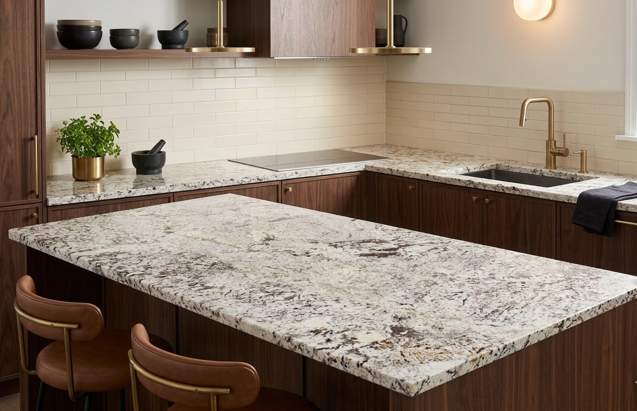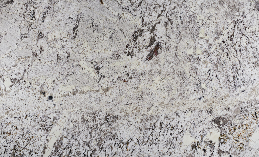 Aneto granite features a striking blend of snowy whites and cool greys accented by intricate charcoal veining and earthy mineral deposits. This dynamic pattern adds organic texture and a refined, high-contrast look to any interior space.
