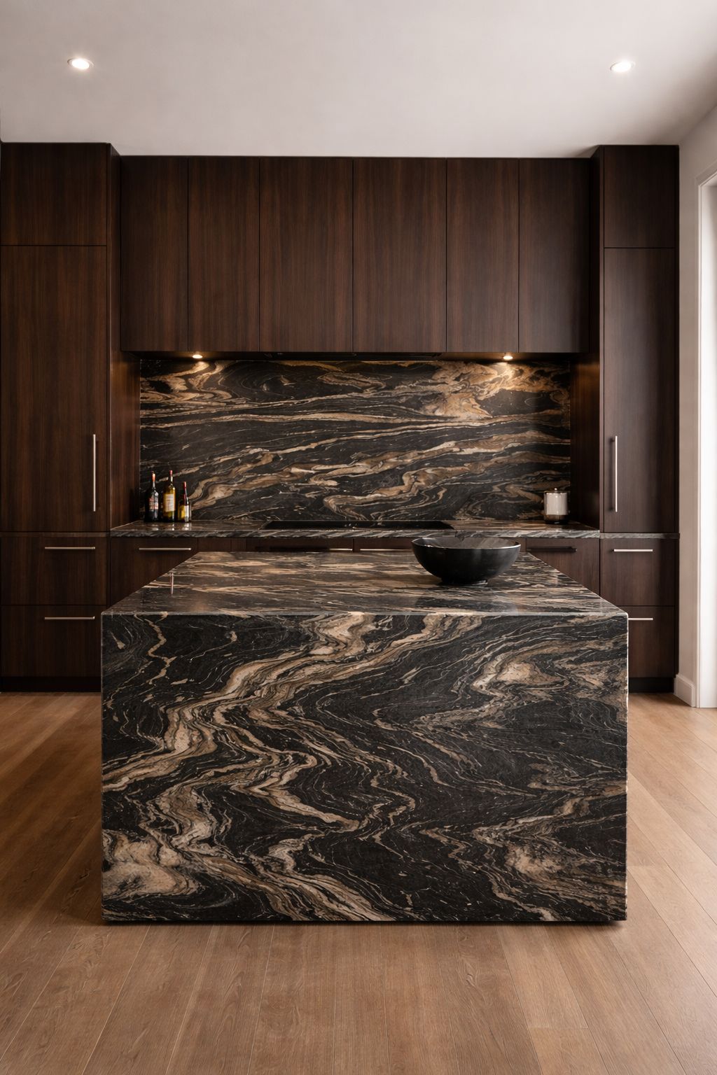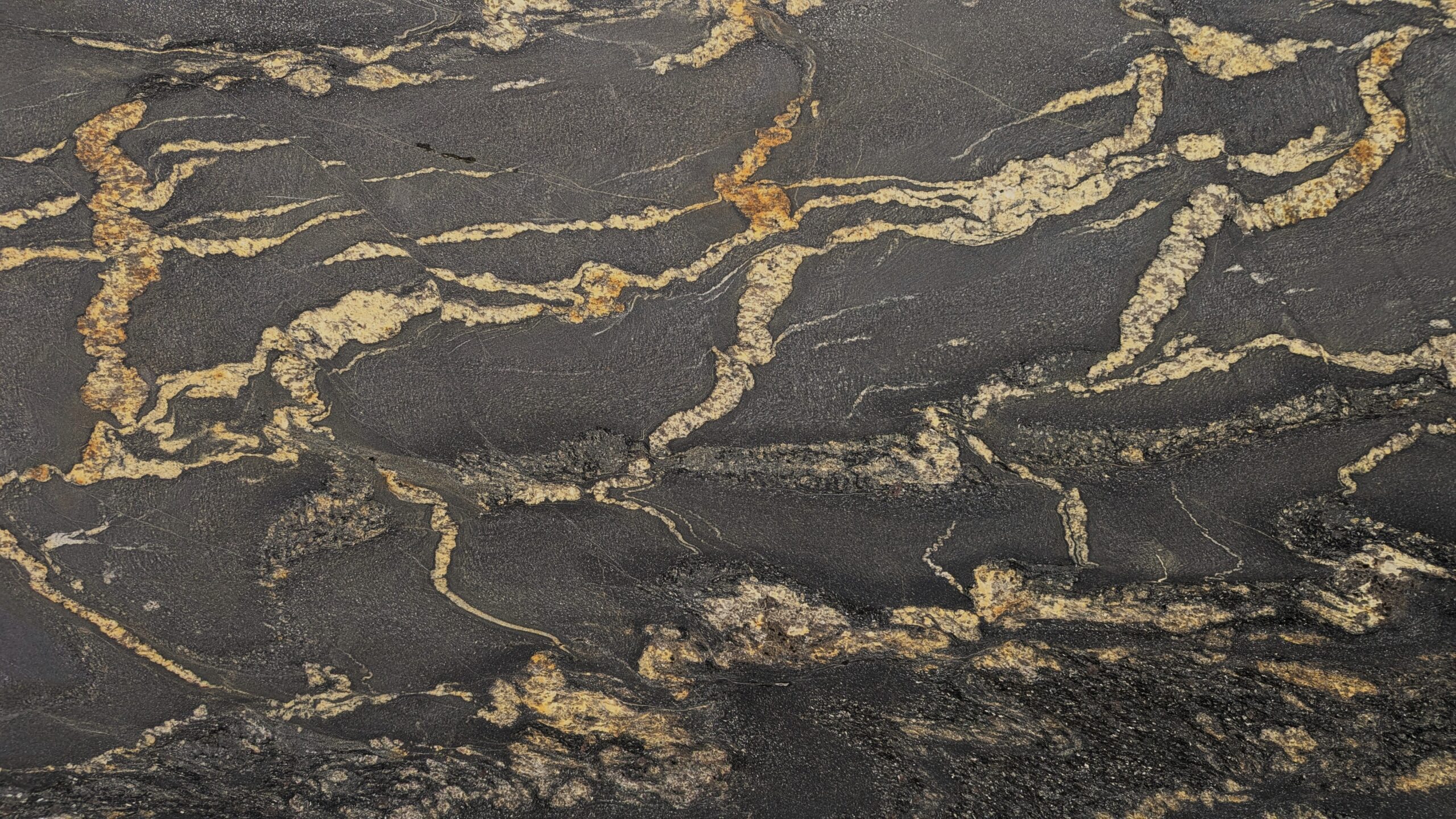 A dramatic granite featuring a deep charcoal canvas electrified by striking veins of gold and bronze. Its sophisticated matte leathered finish offers a tactile, suede-like texture that hides fingerprints while adding bold, organic depth to any space.