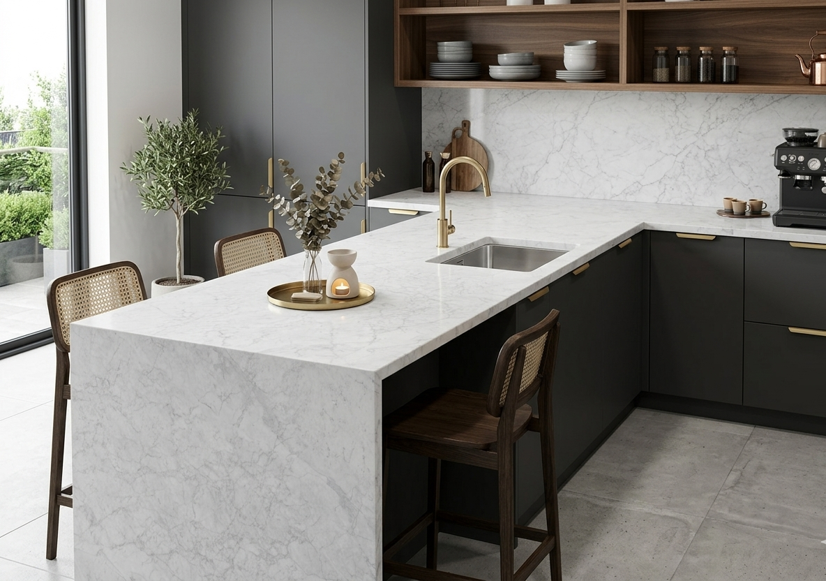 Bianco Carrara granite showcases a classic soft white background layered with delicate, smoky grey feather veining. This iconic stone brings a bright, timeless elegance and a sense of luxury to kitchens, bathrooms, and featured surfaces.
