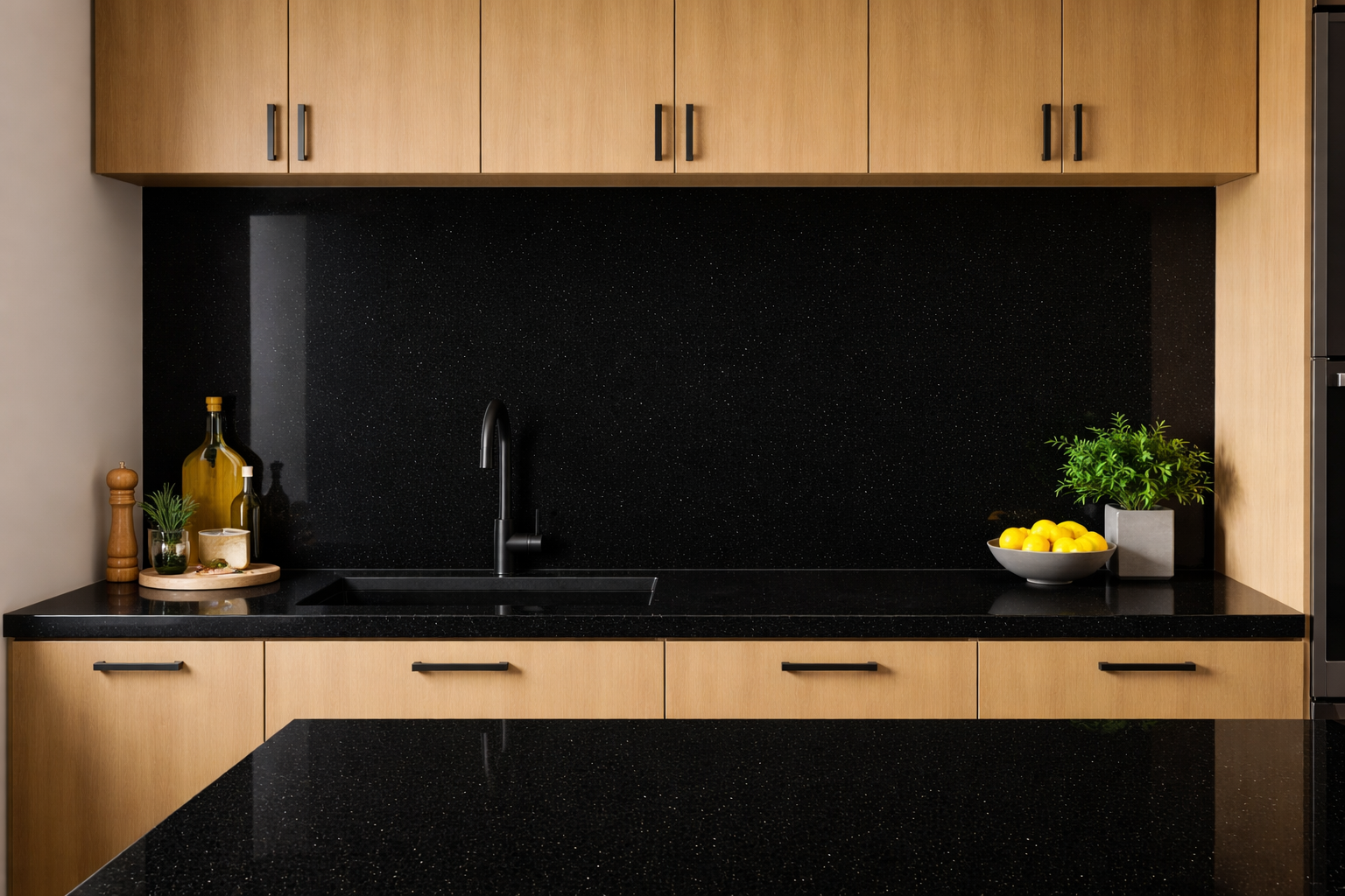 Black Galaxy granite features a deep black background. This durable stone brings a modern, luxurious feel to any space and is especially striking under focused lighting.