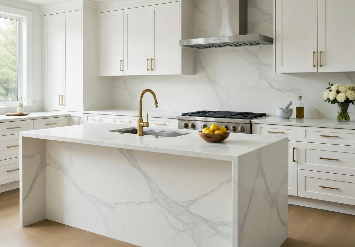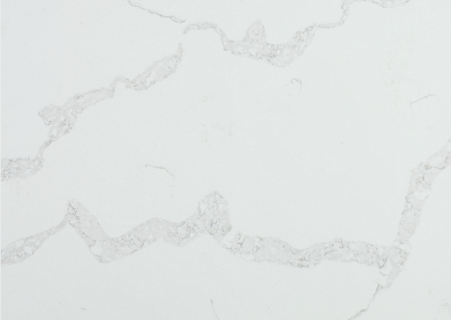 Calacatta Dolce features a clean white background accented by bold, thick grey veining. This quartz provides a striking, modern look that adds character and a sense of luxury to any countertop or vanity surface.