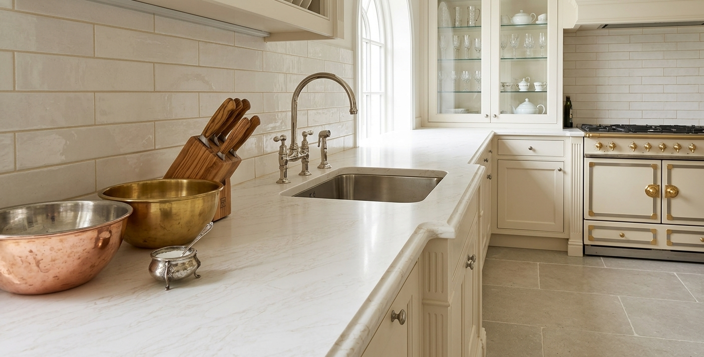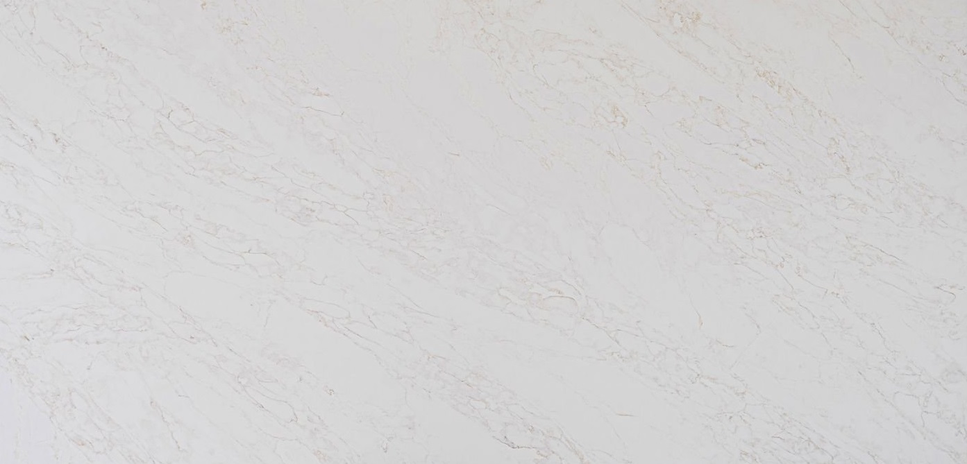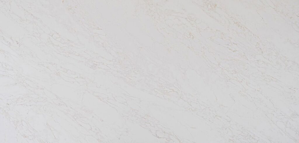 Calacatta Elvin showcases a creamy white base accented by soft, flowing diagonal veins in a warm sandy tone. Its delicate movement and subtle color palette create a serene, welcoming atmosphere for any interior surface.