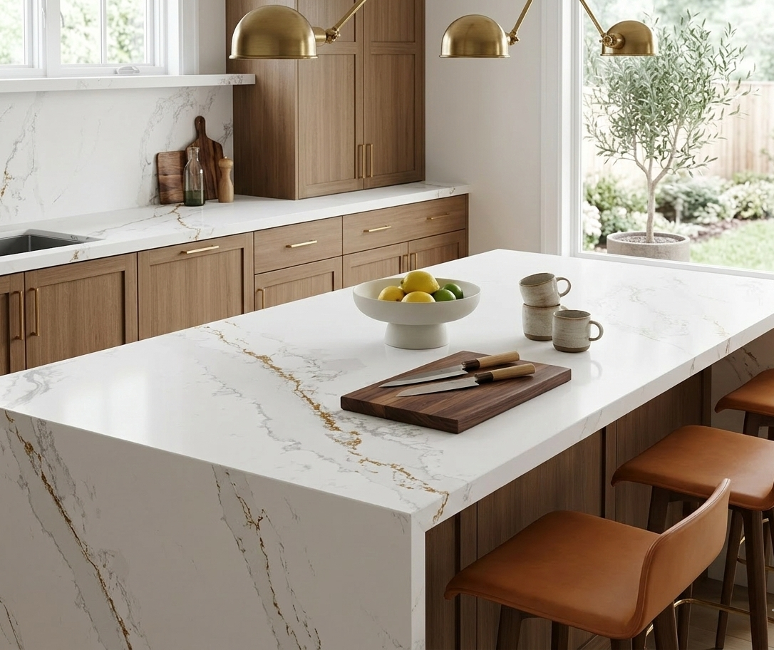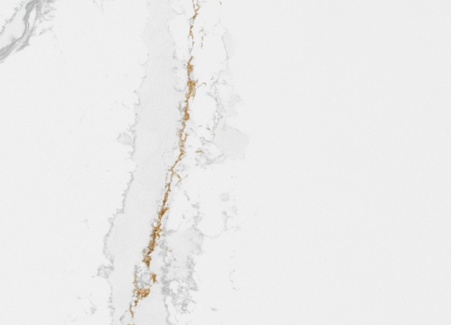 Calacatta Victory features a brilliant white background defined by a bold, central vein with rich gold and grey highlights. This striking quartz offers a high-end marble aesthetic that makes a dramatic statement on kitchen islands and backsplashes.