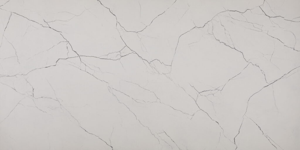 This porcelain slab features a pristine white foundation traversed by dramatic, dark charcoal veining that is both sharp and widely dispersed. Its bold, high-contrast palette evokes the power and elegance of natural Statuario marble, offering a sophisticated and graphic statement for contemporary architectural spaces.