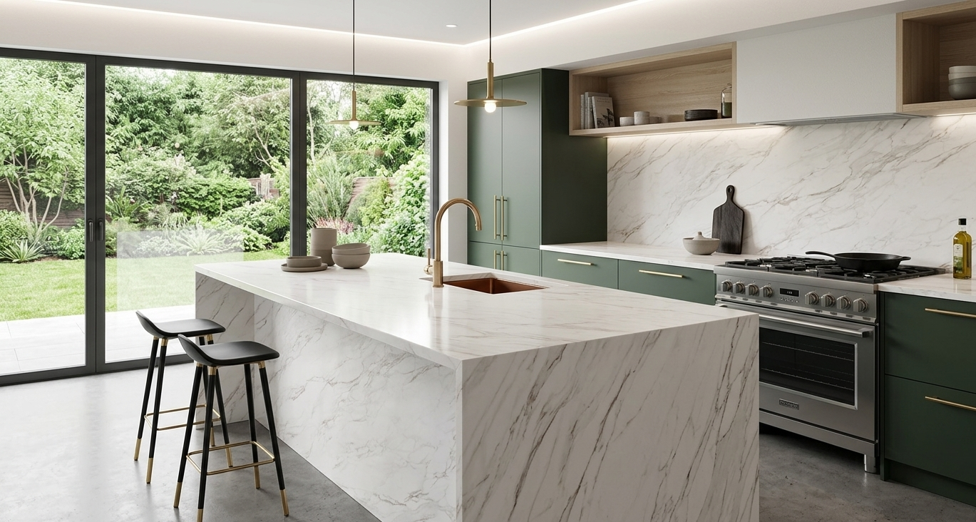 Eternal Statuario features a brilliant white foundation interlaced with soft, feathered grey veining that captures the timeless elegance of classic Italian marble. This sophisticated surface offers a clean, high-end aesthetic perfect for creating luminous kitchen islands and elegant bathroom vanities.