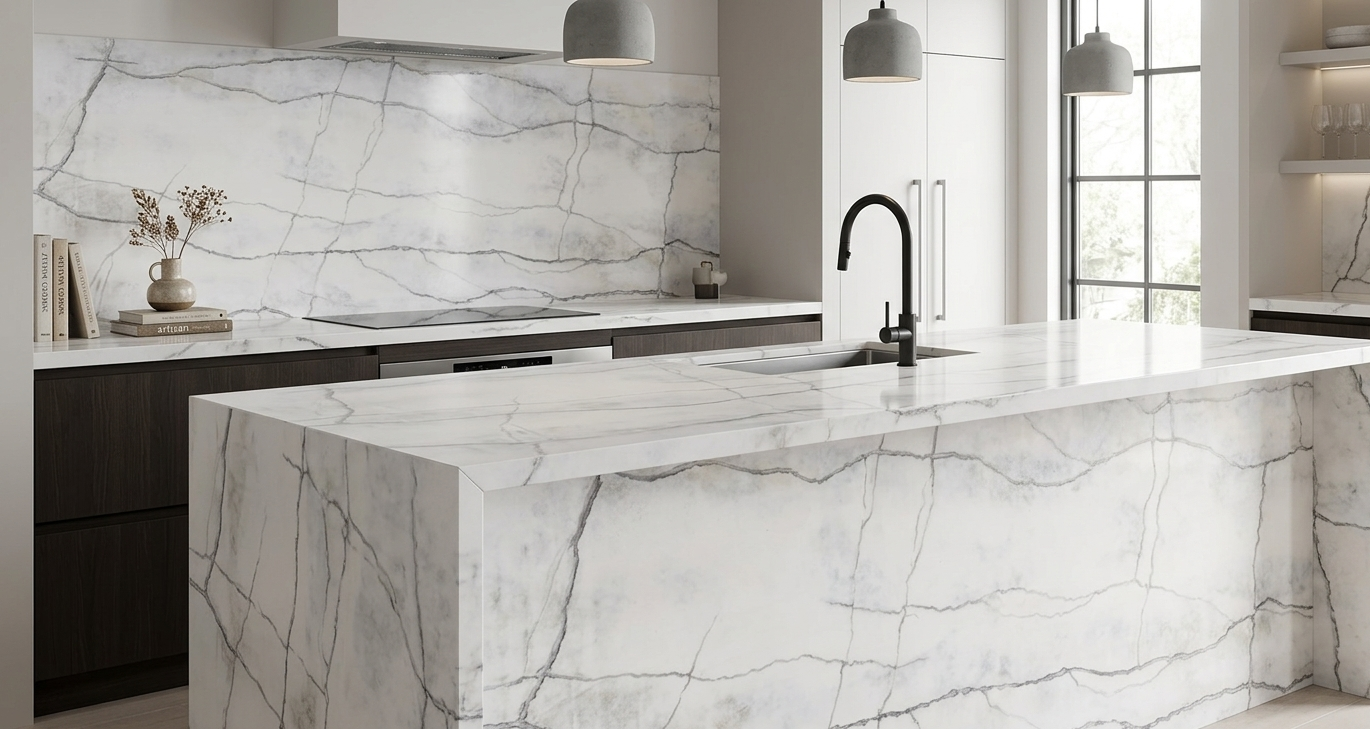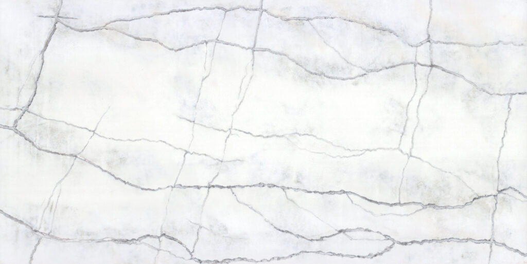 Everest Rave Quartz slab feature a soft white base marked by intricate, cross-cut gray veins that mimic natural marble with a contemporary edge. The high-contrast veining forms a web-like pattern, adding dramatic character without overwhelming the space.