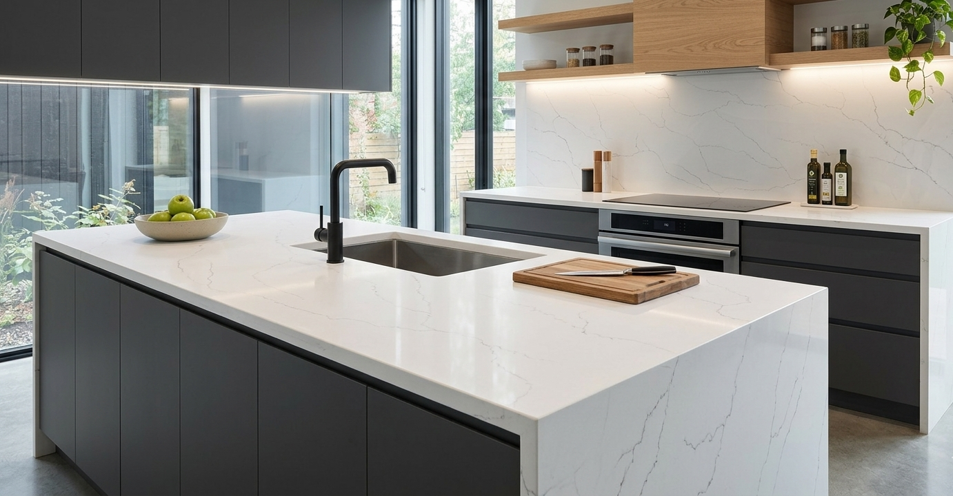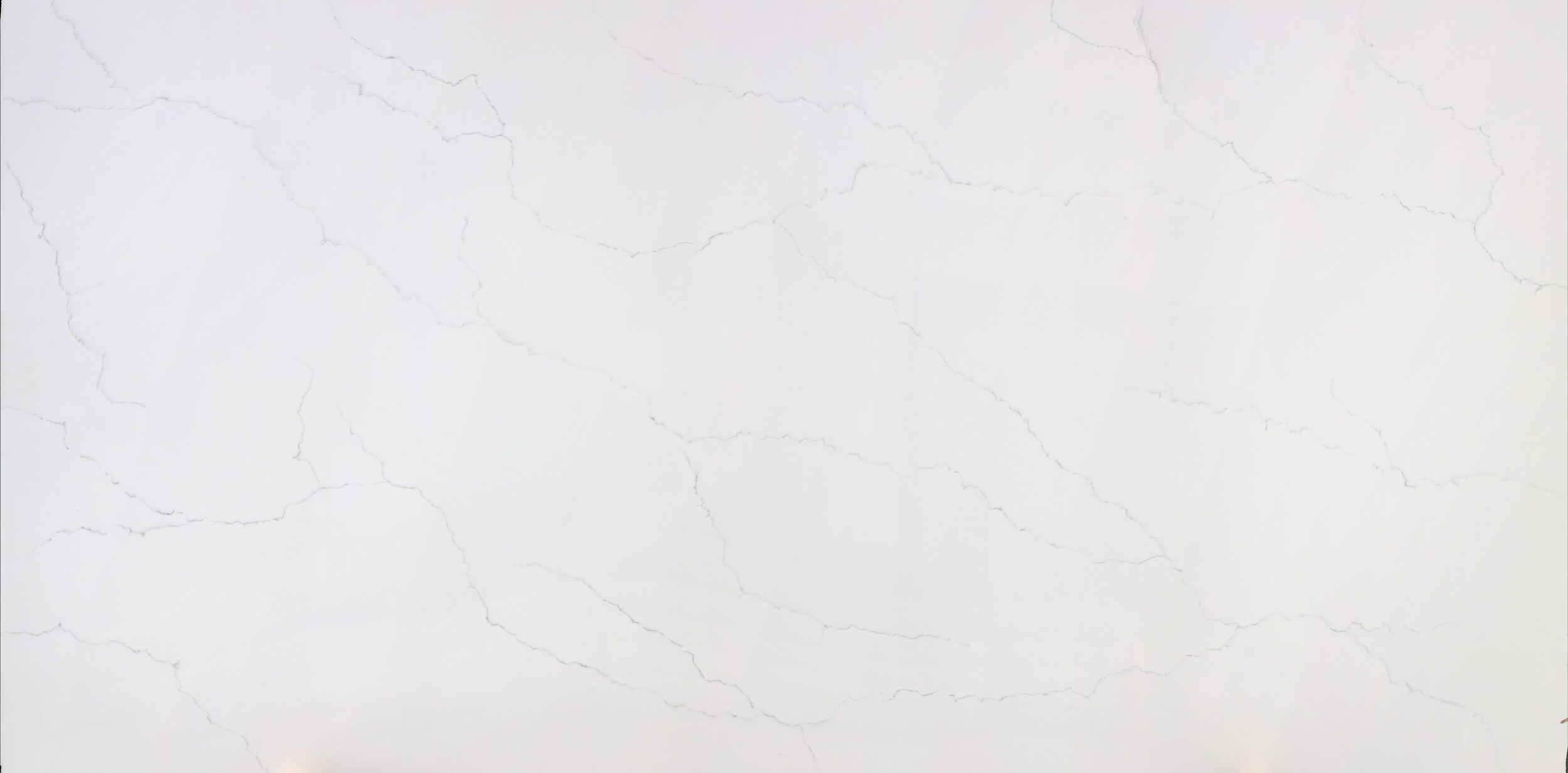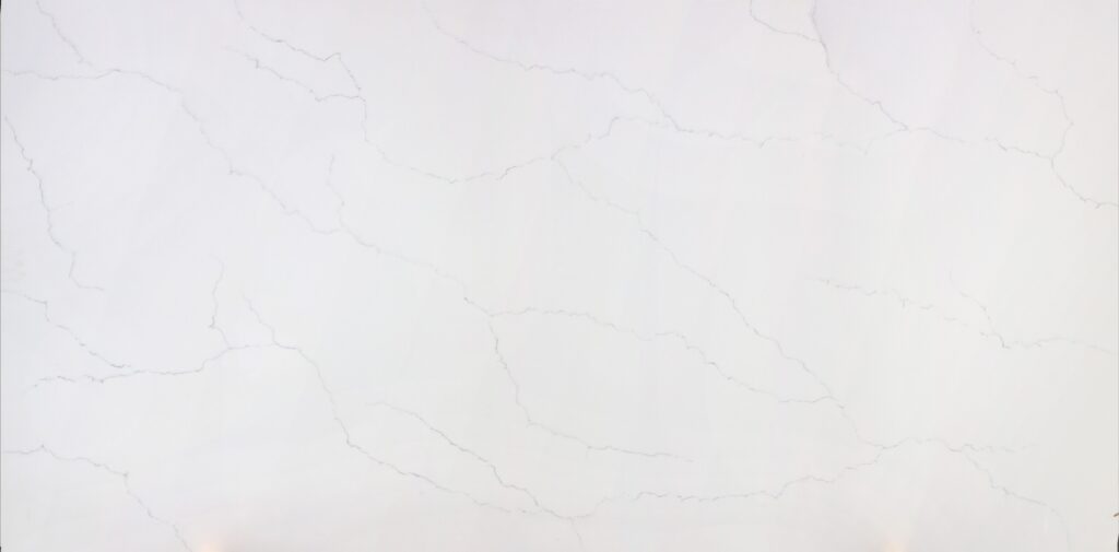 A crisp and clean white surface accented with delicate, wispy gray veining that flows across the slab like hand-drawn lines on parchment. Lincoln’s minimalist elegance makes it a favorite for contemporary kitchens seeking a timeless marble-like appearance without overpowering the space.