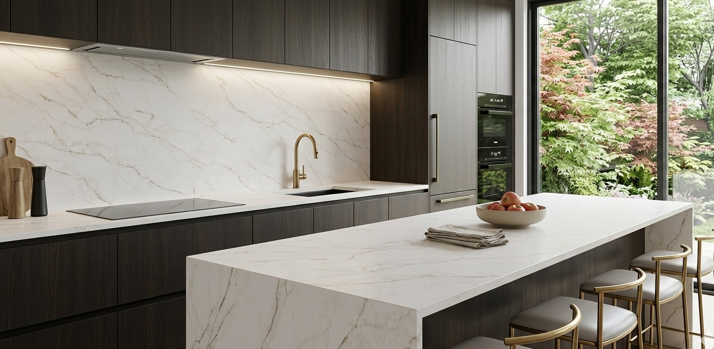 A luminous white backdrop sets the stage for graceful streams of golden veining, adding warmth and movement without overpowering the surface. The effect is elegant and versatile, equally at home in bright modern kitchens, spa-like bathrooms, or statement walls.