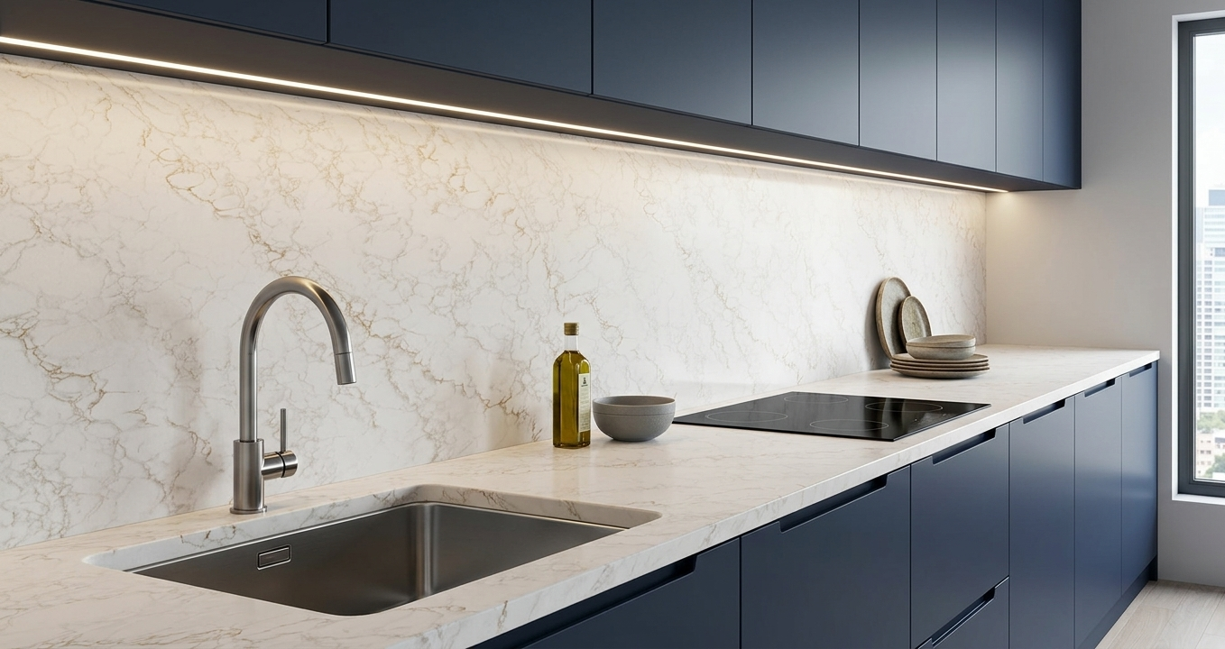 Matmata Dunes channels the quiet beauty of desert landscapes, with a luminous white canvas traced by fine, sandy-gold veining. Its organic patterns evoke wind-swept dunes, creating a surface that feels both natural and refined. Unlike printed surfaces, Matmata Dunes carries its design with subtle authenticity, offering a timeless backdrop for kitchens, bathrooms, and living spaces.