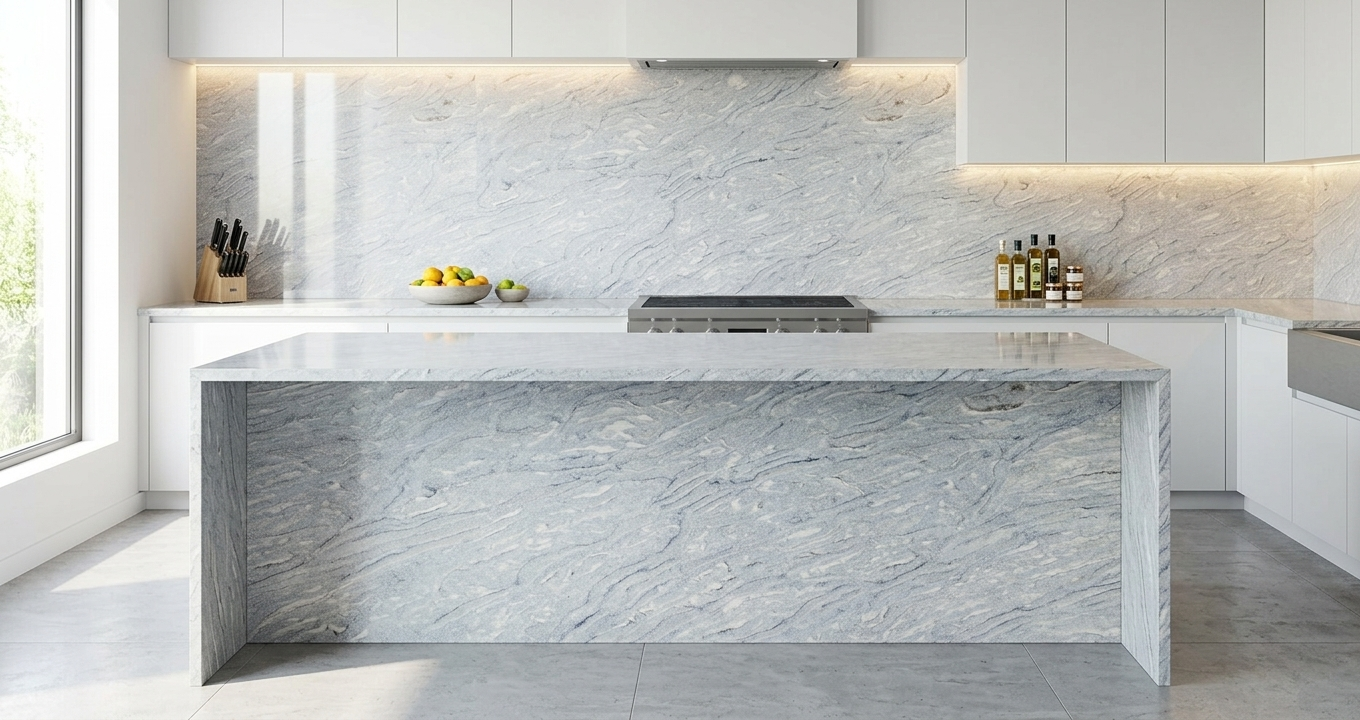 Mavi Aran is a striking quartz slab with flowing wave-like patterns in soft whites, pale greys, and subtle blues. The dynamic veining mimics natural stone movement, creating an elegant and sophisticated surface. Its tranquil palette pairs beautifully with both modern and traditional interiors.