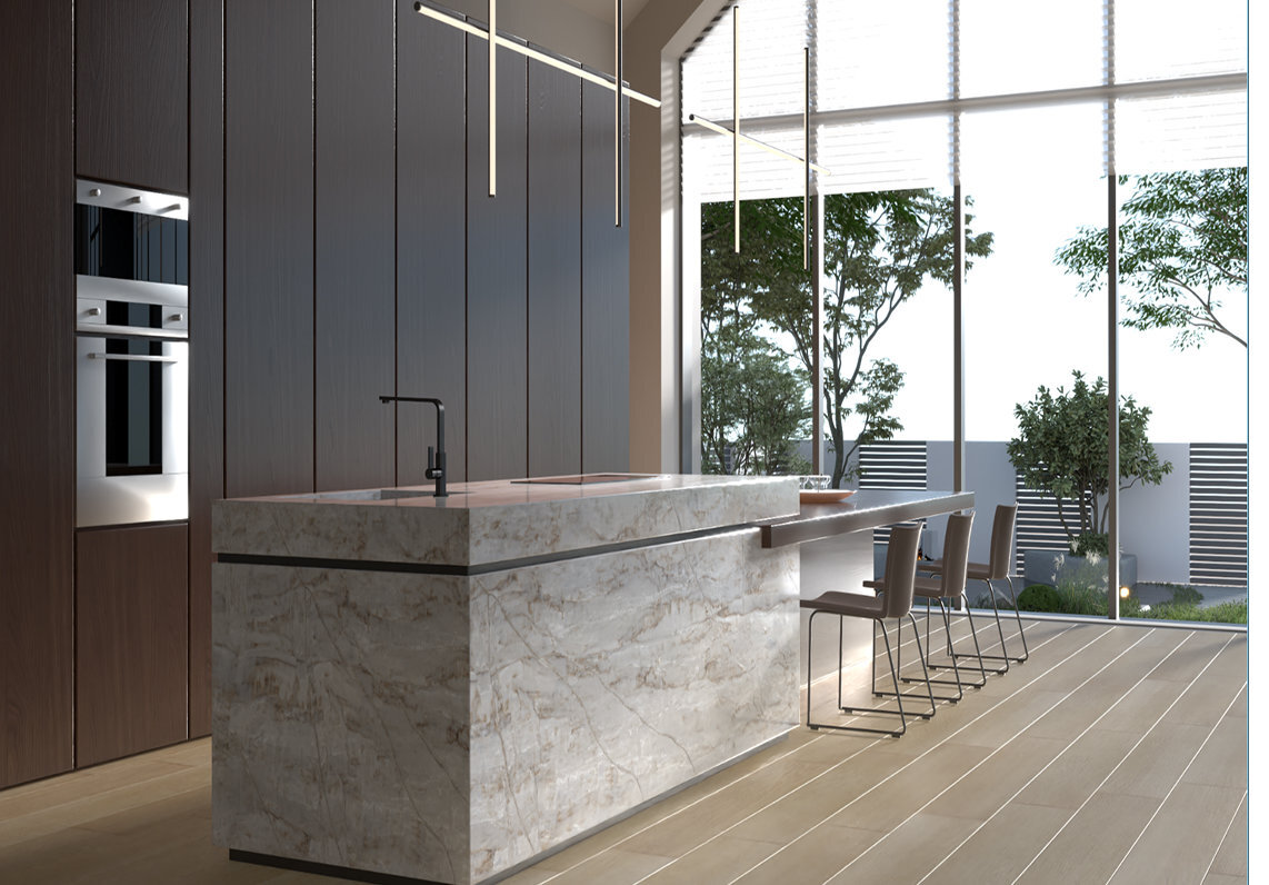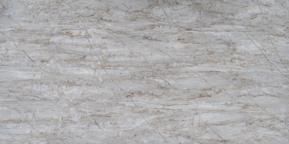 Mürren brings a serene sense of movement with its layered taupe veining flowing over a soft, misty background. This quartz slab creates an atmosphere of understated elegance, reminiscent of wind-sculpted stone or cloud-covered mountain ridges. Its organic texture and warm hues make it a versatile choice for both contemporary and natural-inspired interiors.