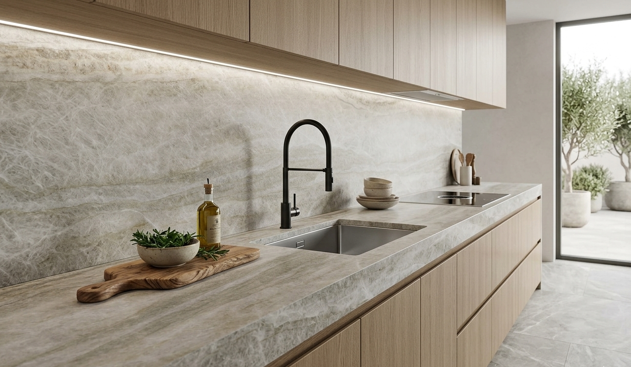 Perla Venata quartzite offers a soft, pearlescent cream background detailed with delicate sandy veining and subtle golden undertones. This elegant stone provides a warm and tranquil aesthetic, combining the sophisticated look of marble with the exceptional durability required for high-traffic surfaces.