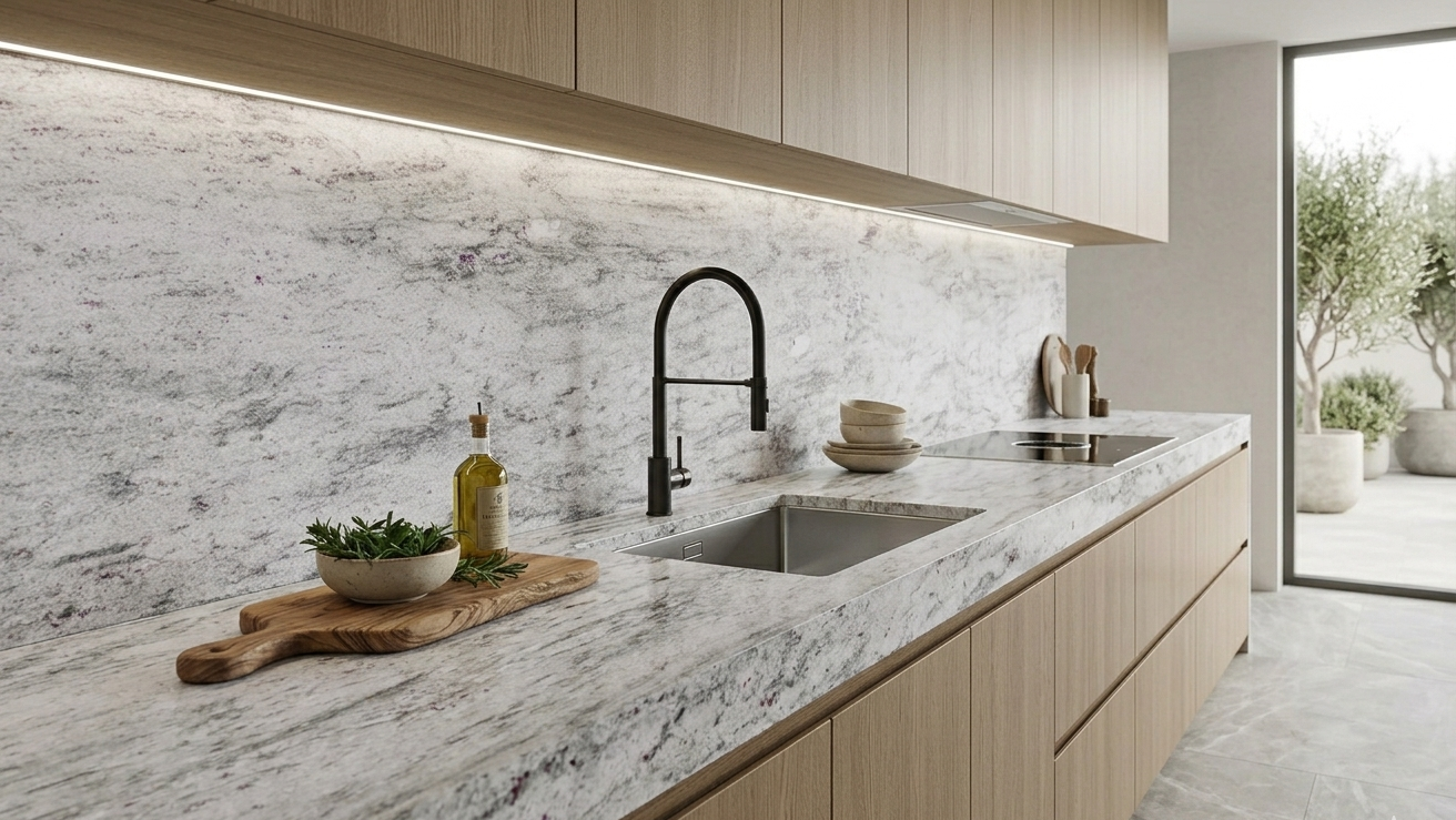 Sigma White granite presents a crisp white background layered with soft grey horizontal veining and subtle garnet-colored flecks. This luminous stone offers a clean, airy aesthetic that brings a sense of modern movement to kitchens and bathrooms.