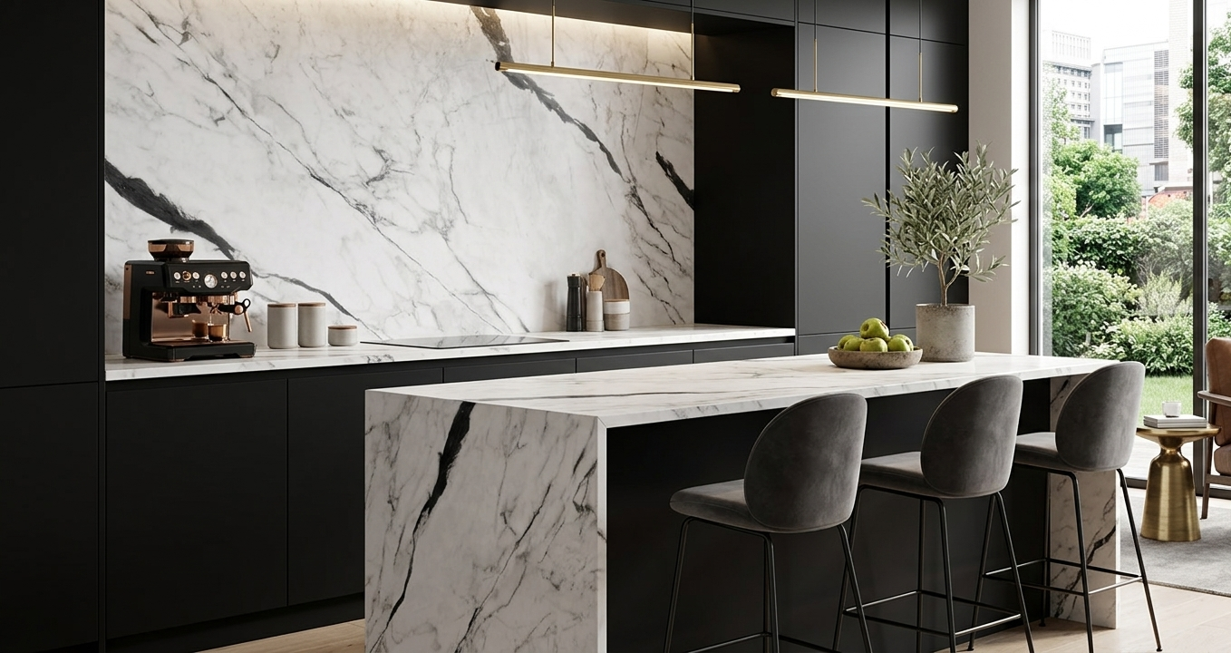 Statuario features its own unique veining pattern and movement, giving each slab a distinct visual identity. Designed for countertops, walls, and architectural applications, this Ultra Compact Surface offers durability, low maintenance, and long-term performance while elevating the overall design of the space.