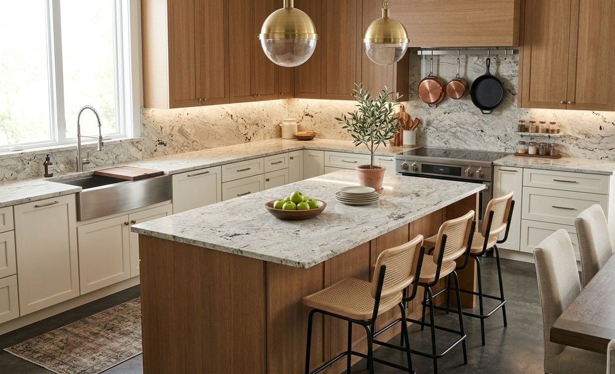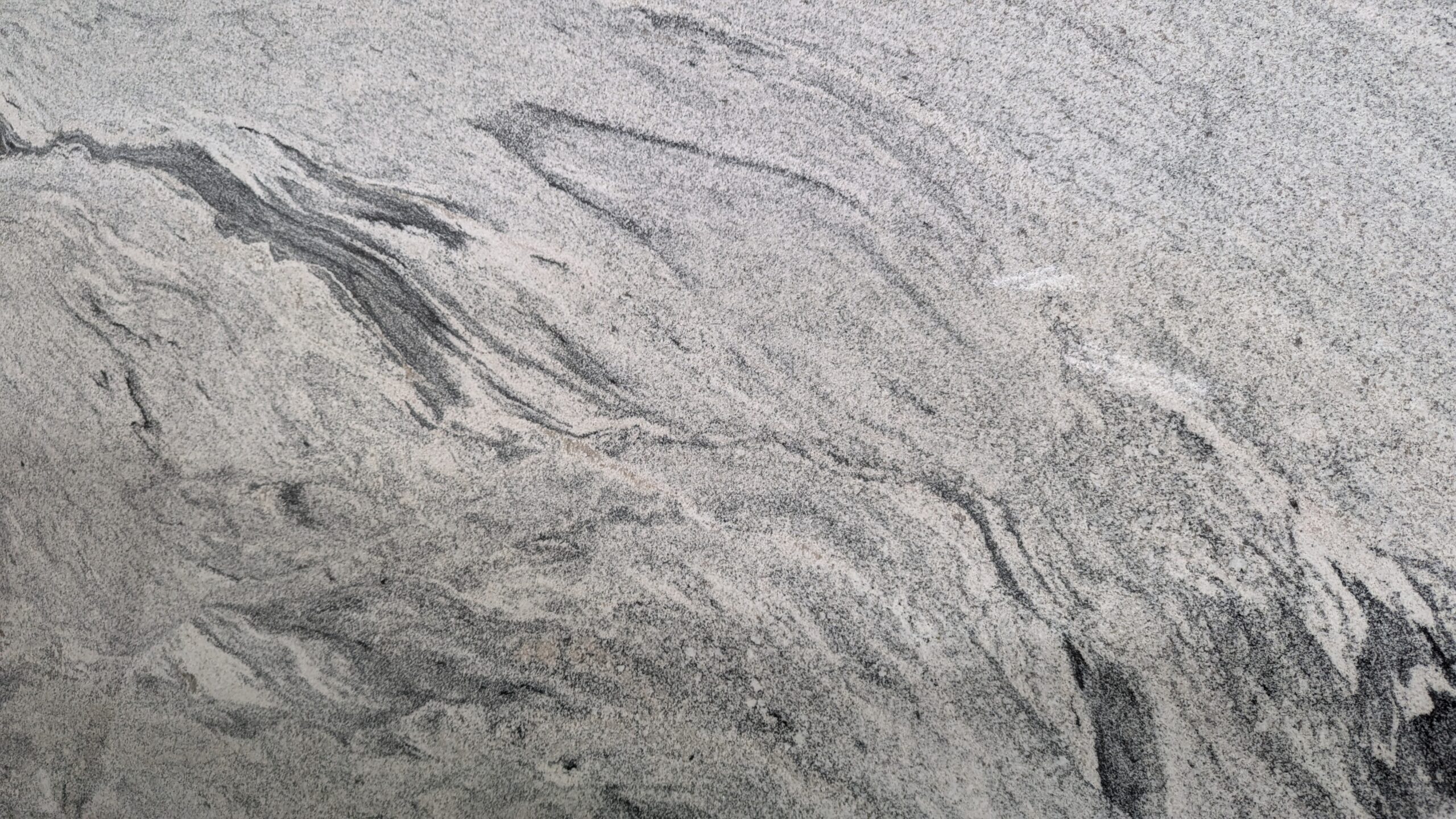 A modern, high-contrast granite characterized by sweeping, dramatic bands of charcoal and dark grey flowing across a cool-toned white surface. This stone offers a bold, movement-filled look that serves as a striking focal point.