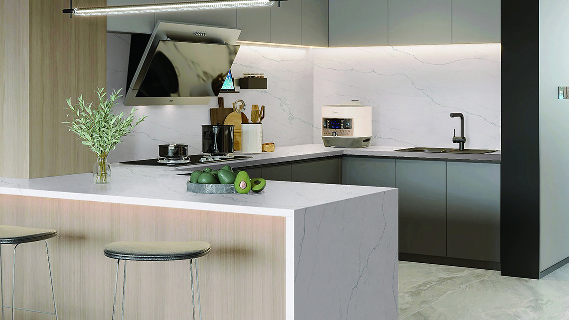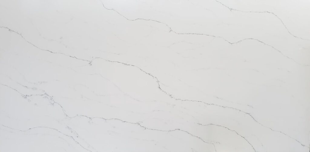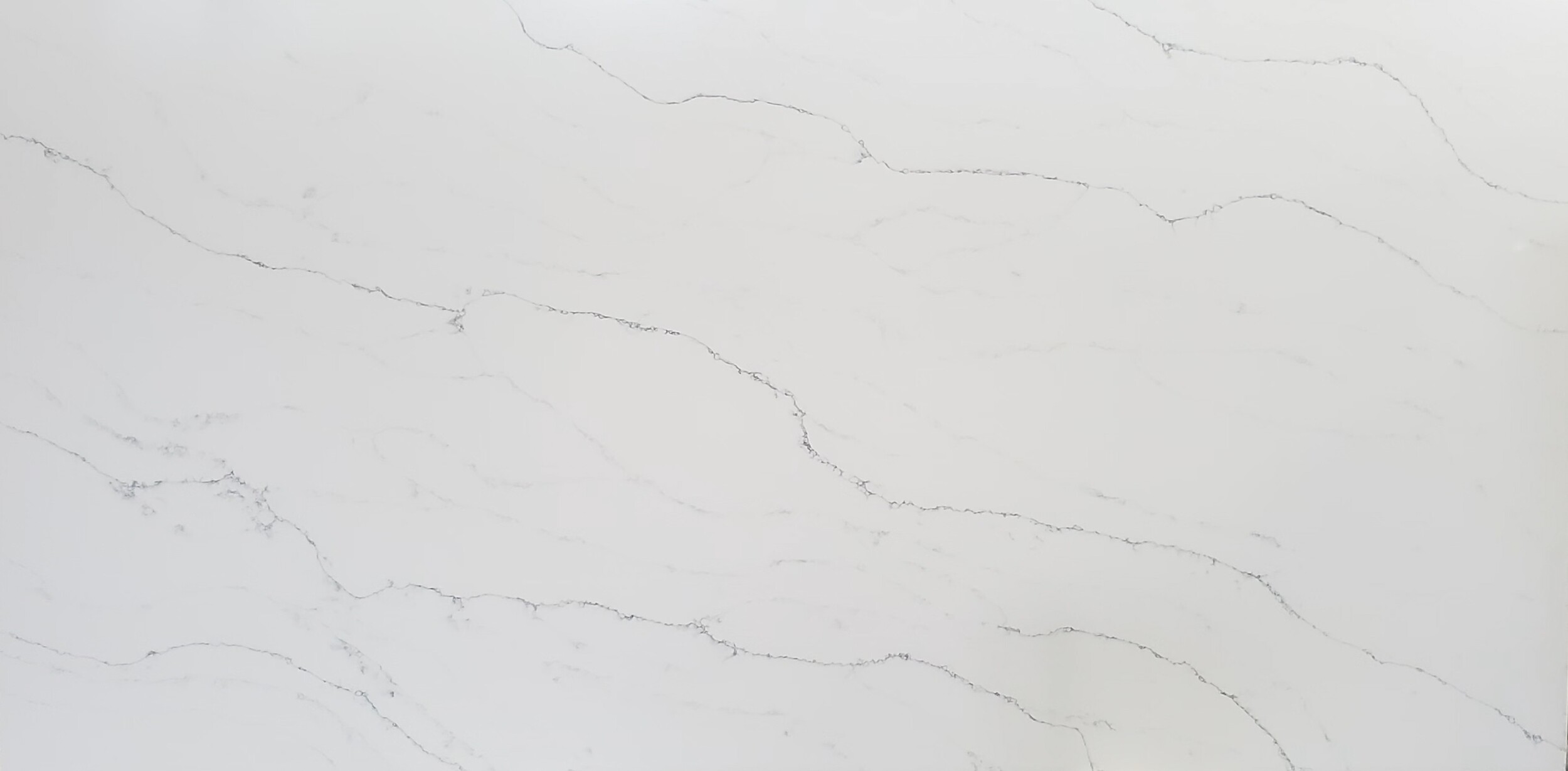 This quartz slab showcases a crisp, alpine white surface accented by delicate, wispy grey veining that flows gracefully across the stone. Its clean aesthetic and subtle patterns offer a timeless, elegant look that seamlessly complements both classic and contemporary interiors.