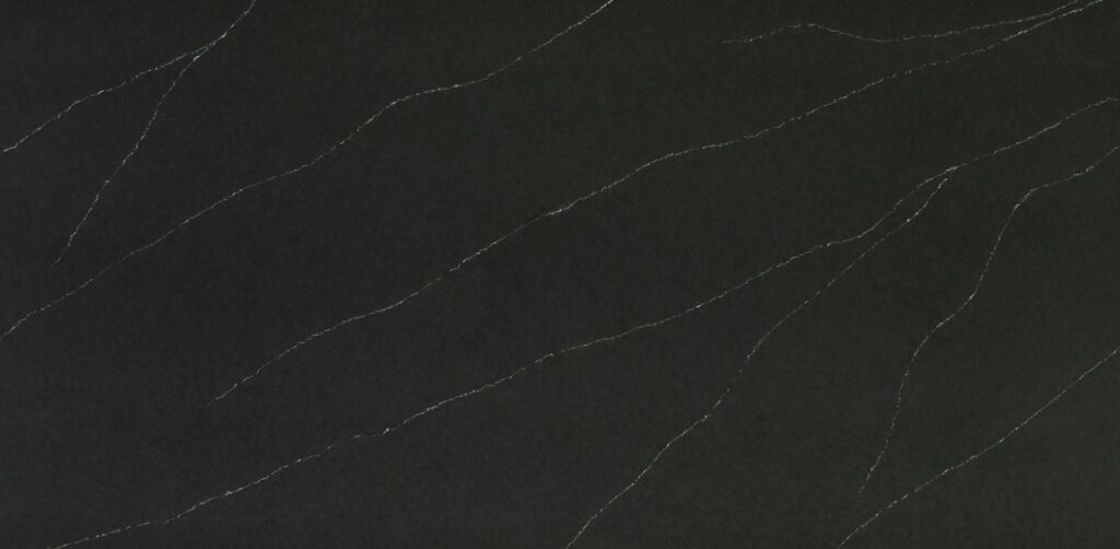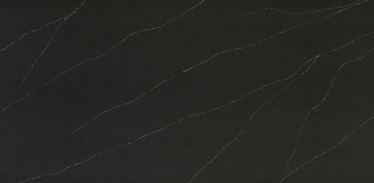 This quartz slab features a deep, charcoal-black background with long, elegant white veins that mimic the natural beauty of traditional soapstone. Its clean lines and dark, velvety tone provide a striking, modern contrast that works perfectly for sophisticated kitchen islands and countertops.