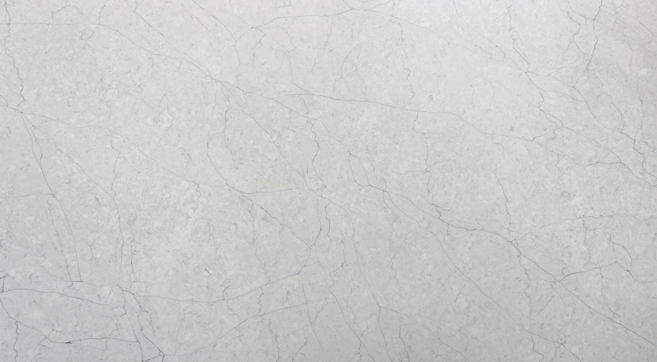 This quartz slab features a luminous white base with an intricate, cracked-vein pattern that beautifully replicates the classic look of Carrara marble. Its soft tonal shifts and fine grey webbing offer a sophisticated, high-end texture that brings a sense of refined elegance to any space.