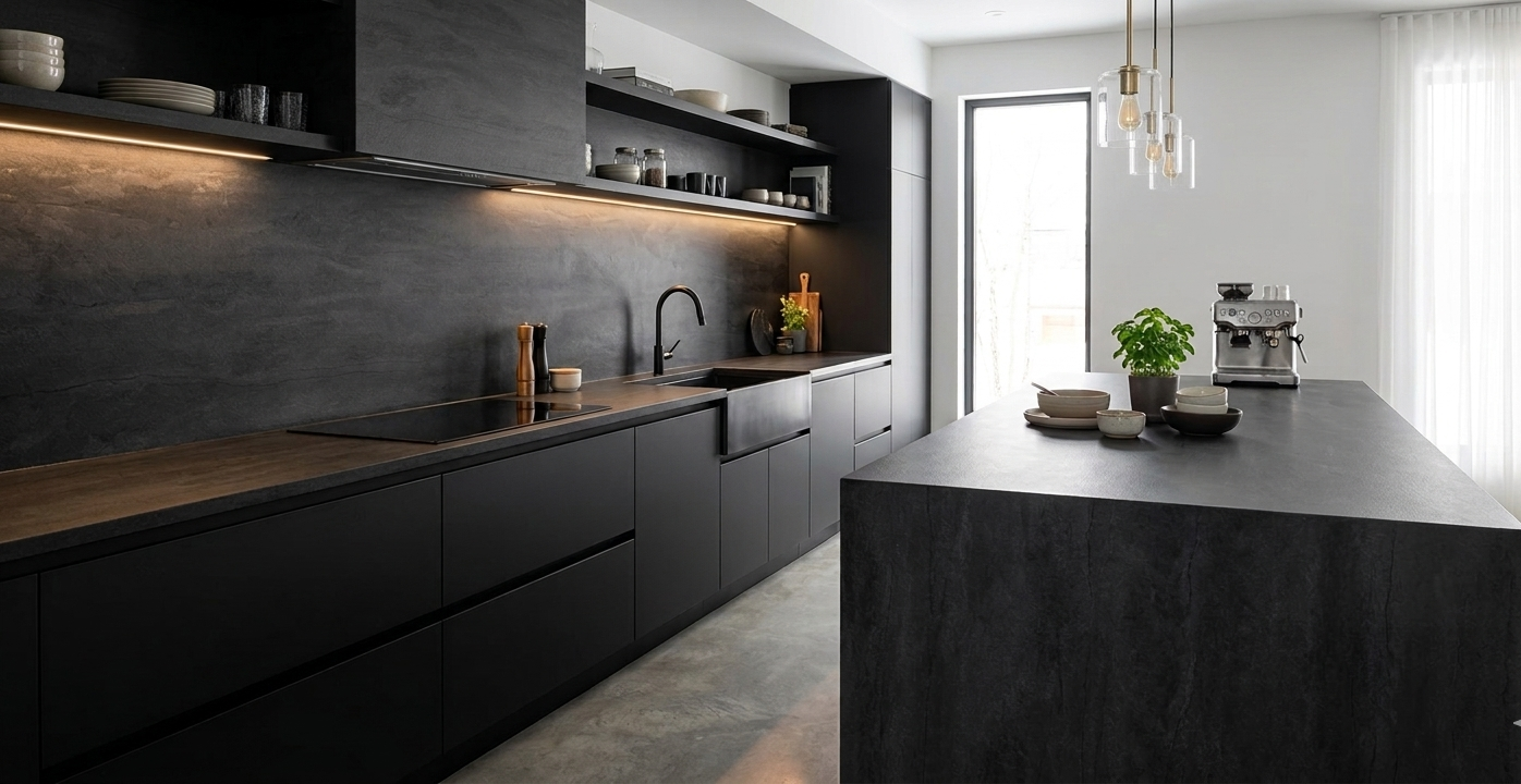 This quartz slab captures the raw, organic essence of natural stone with its deep charcoal hues and subtle, horizontal layered textures. Its matte-like finish and moody tonal depth offer a sophisticated, grounded aesthetic perfect for industrial or contemporary designs.
