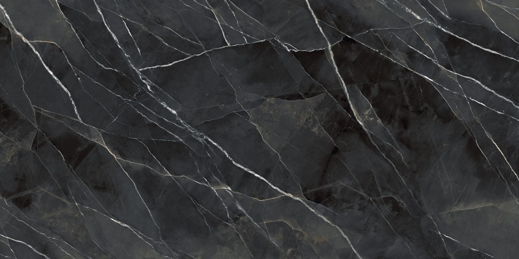 A bold, obsidian field is defined by sharp, tectonic fractures of frost-white and amber, creating a look of raw, geological power. Its textured surface and high-contrast veining provide a commanding presence, perfect for dramatic statement walls or sophisticated kitchen islands.