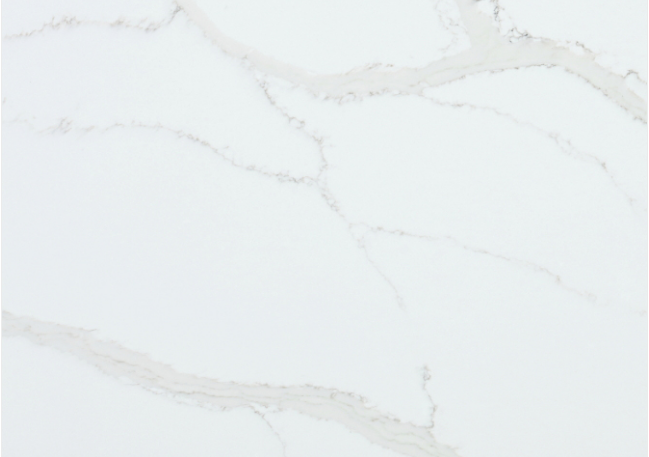 Calacatta Crystal features a bright white surface adorned with delicate, flowing veins in soft taupe and light grey. This quartz offers a refined, marble-inspired look that brings a clean and timeless elegance to any kitchen or vanity.