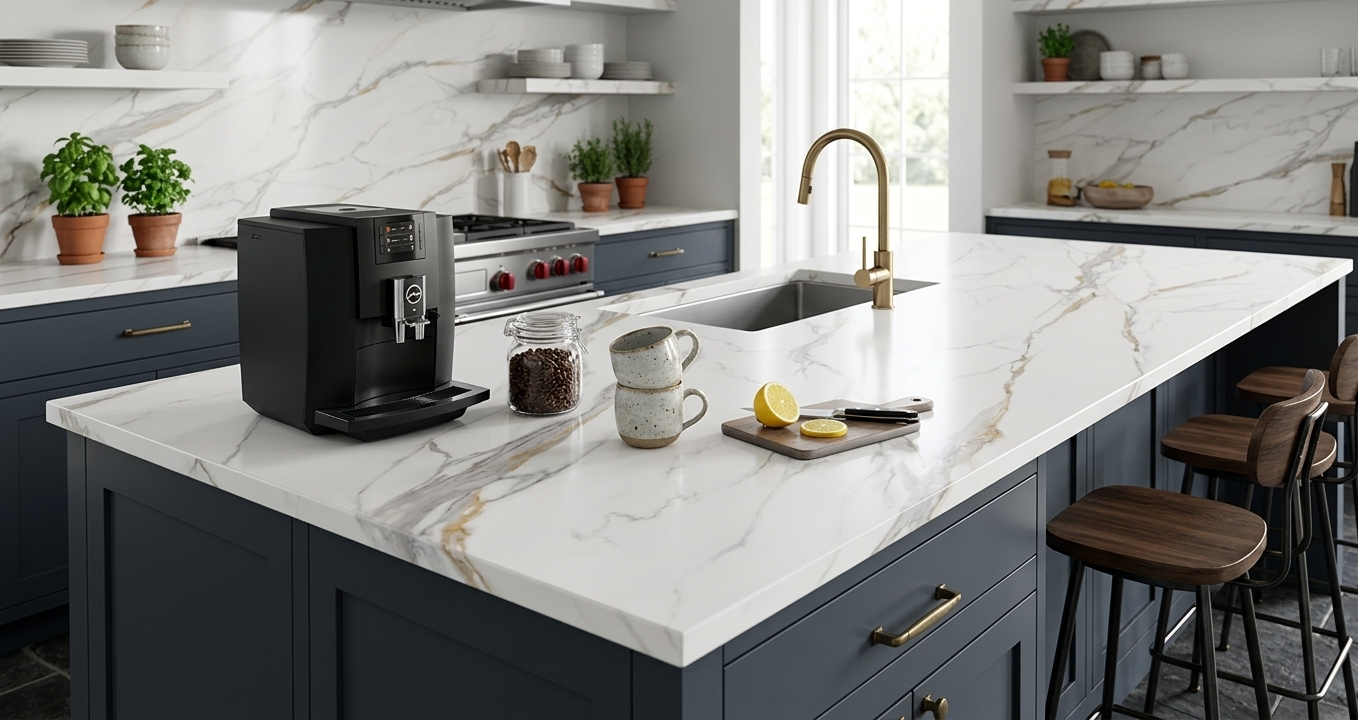 Calacatta Topaz features its own unique veining pattern and movement, giving each slab a distinct visual identity. Designed for countertops, walls, and architectural applications, this Ultra Compact Surface offers durability, low maintenance, and long-term performance while elevating the overall design of the space.