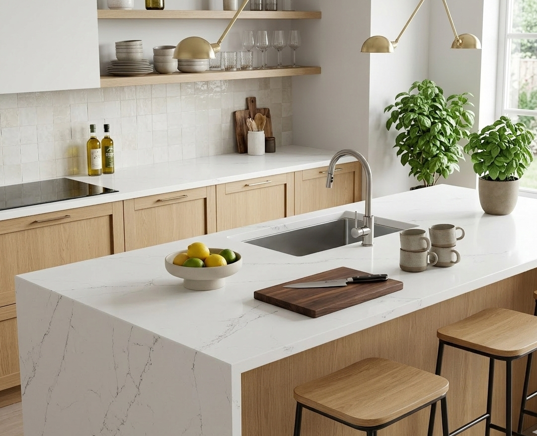 Calacatta Veneto features a soft, cool white surface with delicate, wispy grey veining that creates an elegant and understated marble look. This refined quartz is a perfect choice for creating a bright, timeless atmosphere in any kitchen or bathroom.
