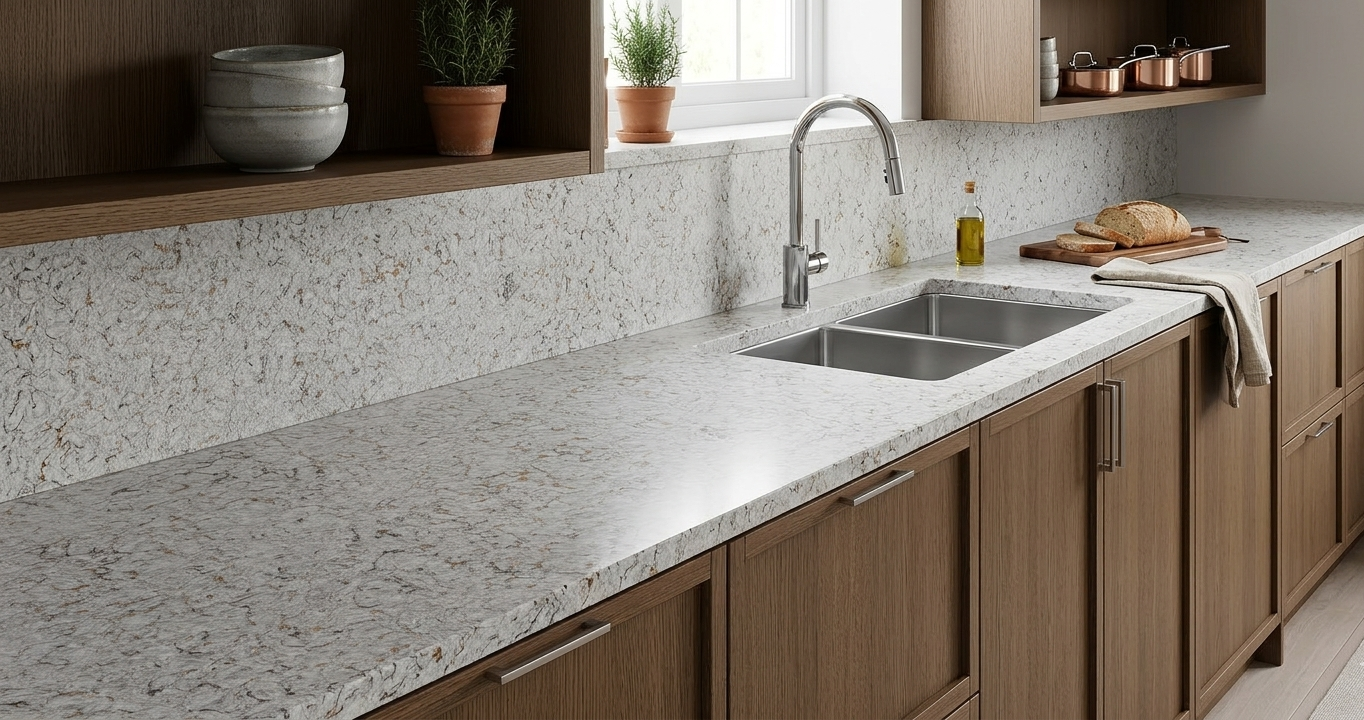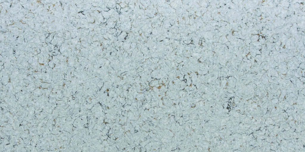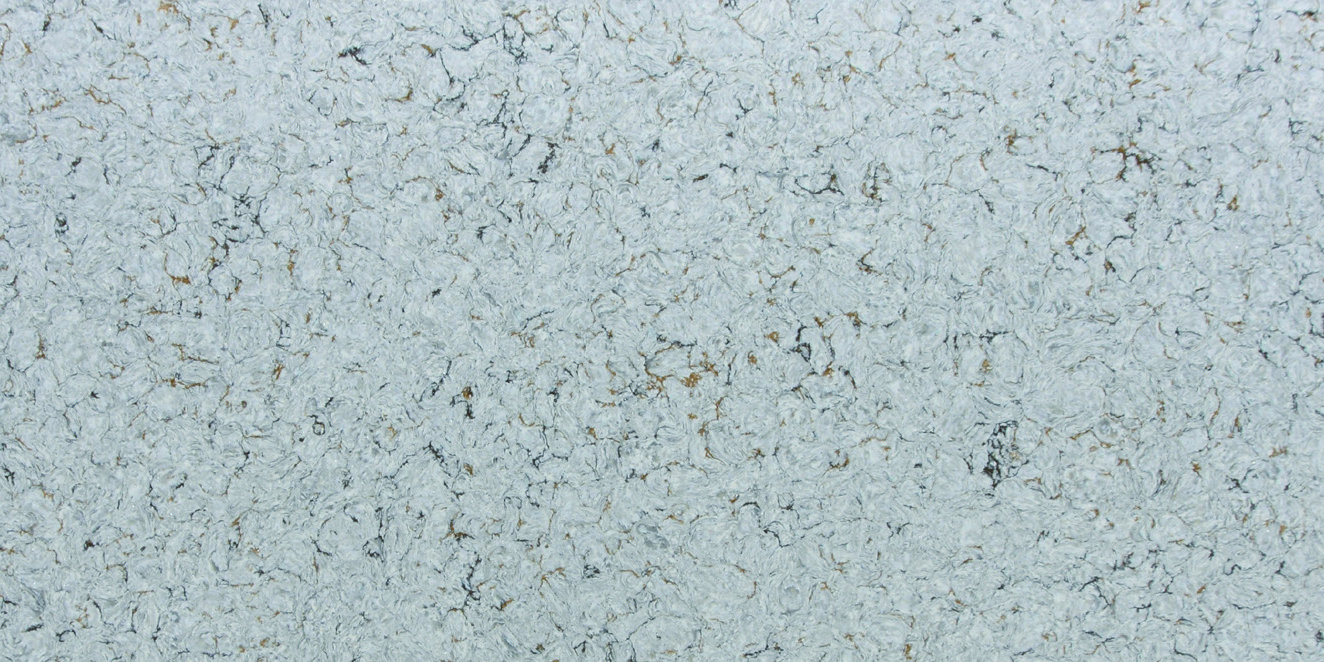 This quartz slab features a light grey and white base with a dense, swirling pattern that mimics the appearance of natural granite. Its intricate, mottled texture is accented by subtle earthy flecks, providing a durable and stylish surface that fits perfectly in any busy kitchen or bathroom.