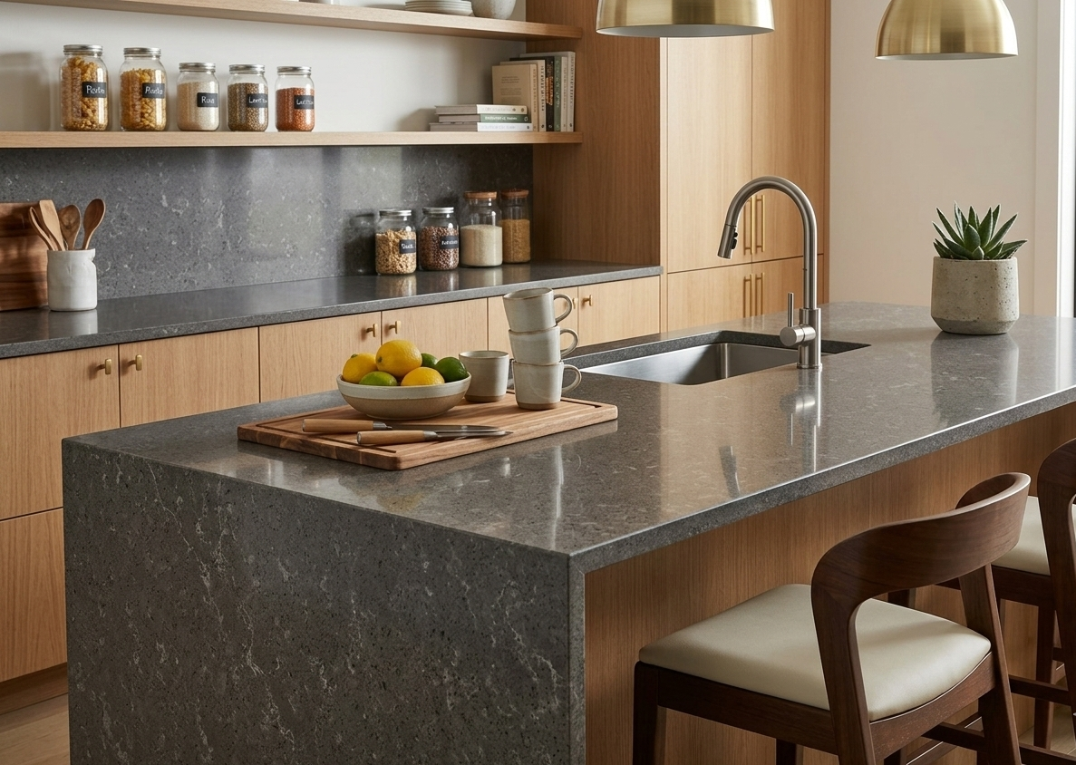 Contrail features a moody, charcoal-grey base with a fine-grained pattern and soft, cloudy accents. This quartz offers a sophisticated, uniform appearance that provides a bold foundation for modern kitchen islands and commercial surfaces.