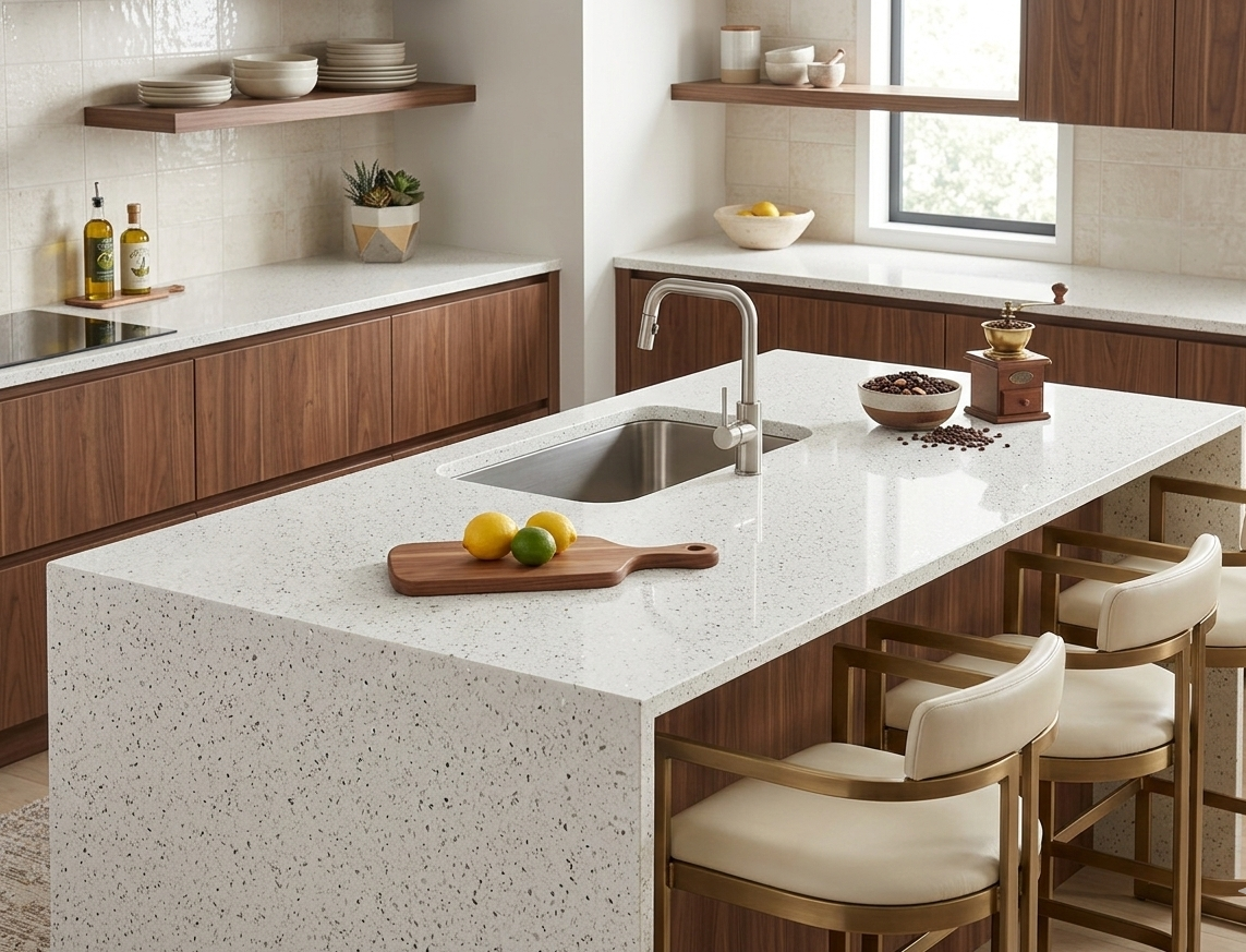 Gentle Grey features a light, luminous base embedded with translucent grey and crystalline fragments that create a subtle shimmering effect. This elegant quartz offers a bright, airy aesthetic that complements both modern and traditional interior designs.