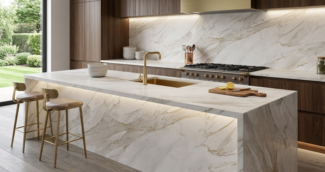 Gold Borghini features its own unique veining pattern and movement, giving each slab a distinct visual identity. Designed for countertops, walls, and architectural applications, this Ultra Compact Surface offers durability, low maintenance, and long-term performance while elevating the overall design of the space.