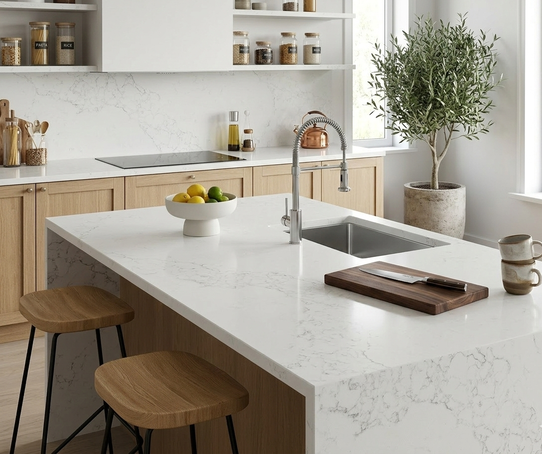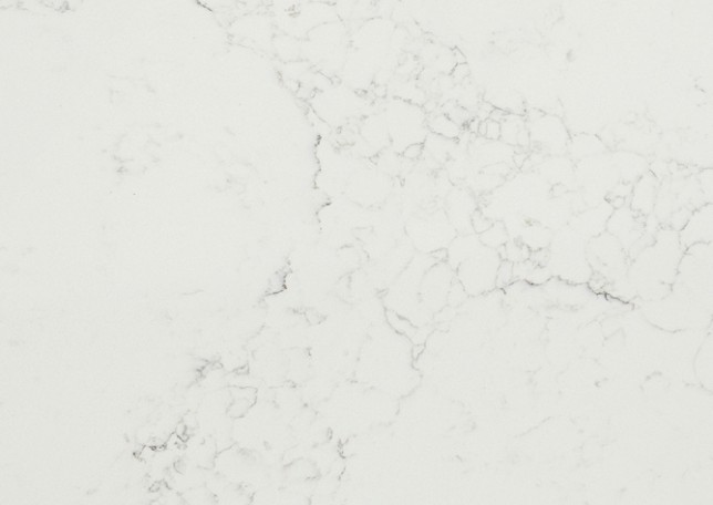 Juniper features a creamy white background interlaced with delicate, flowing grey veining that creates a soft and organic marble-like appearance. Its elegant and subtle pattern makes it a versatile choice for bright kitchen islands or sophisticated bathroom vanities.