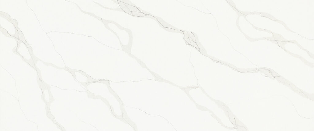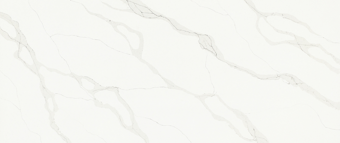 This quartz slab showcases a soft, milky white foundation with flowing, wide-set veins in a muted dove-grey. The rhythmic, organic movement mimics the graceful appearance of natural Calacatta, offering a high-end, airy aesthetic that works perfectly for expansive island tops and elegant, modern backsplashes.
