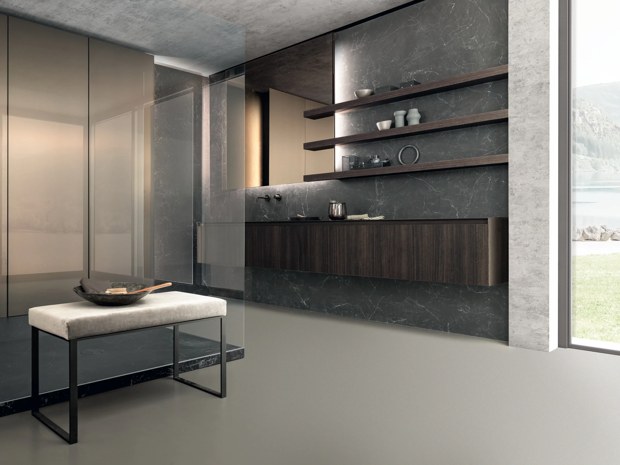 Nero Greco features a velvety charcoal-black base layered with an intricate web of fine, spider-like white veining. Its natural finish offers a matte, stone-like texture that provides a sophisticated and moody depth, making it an excellent choice for bold, contemporary kitchen islands or statement wall cladding.