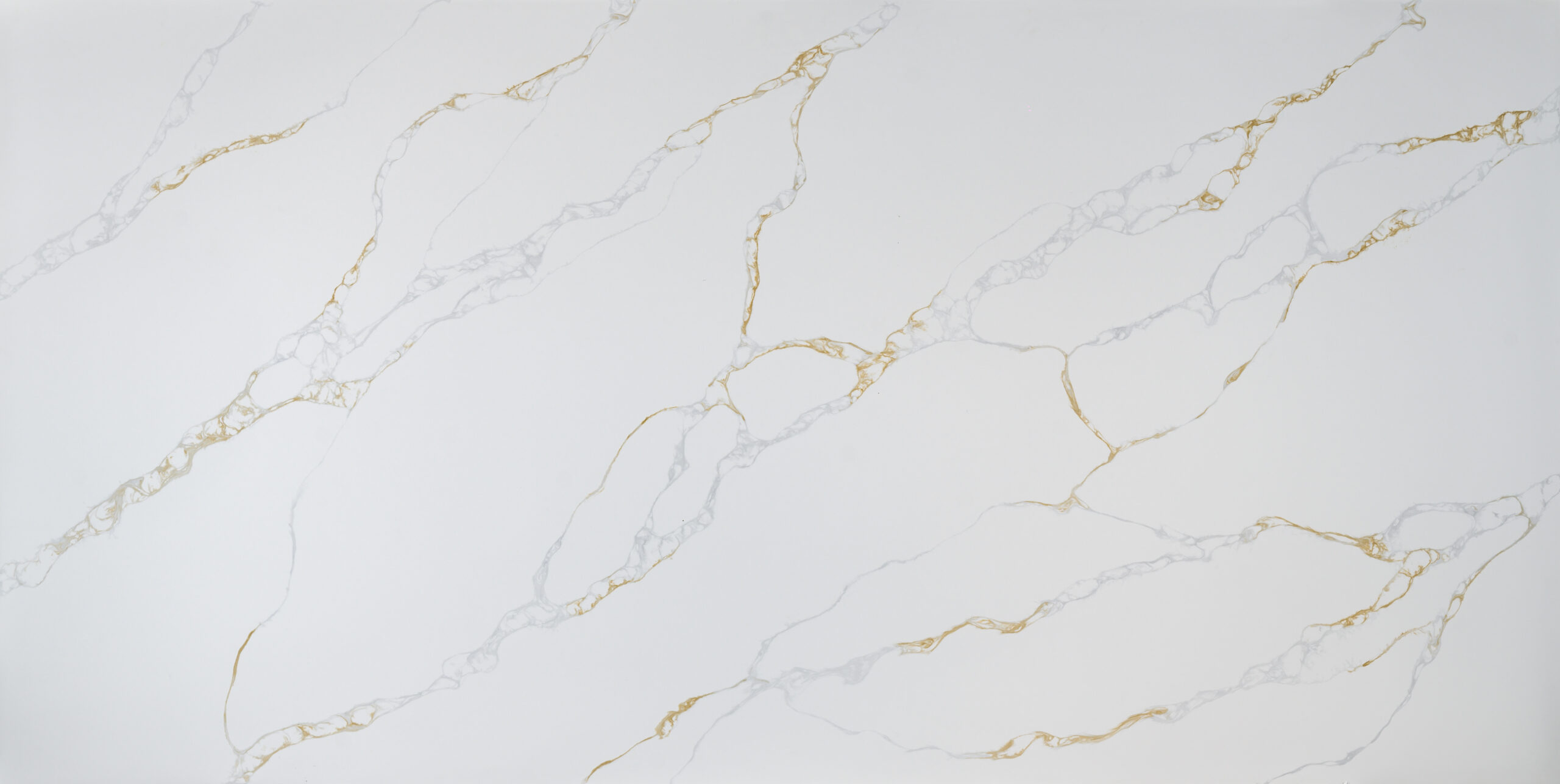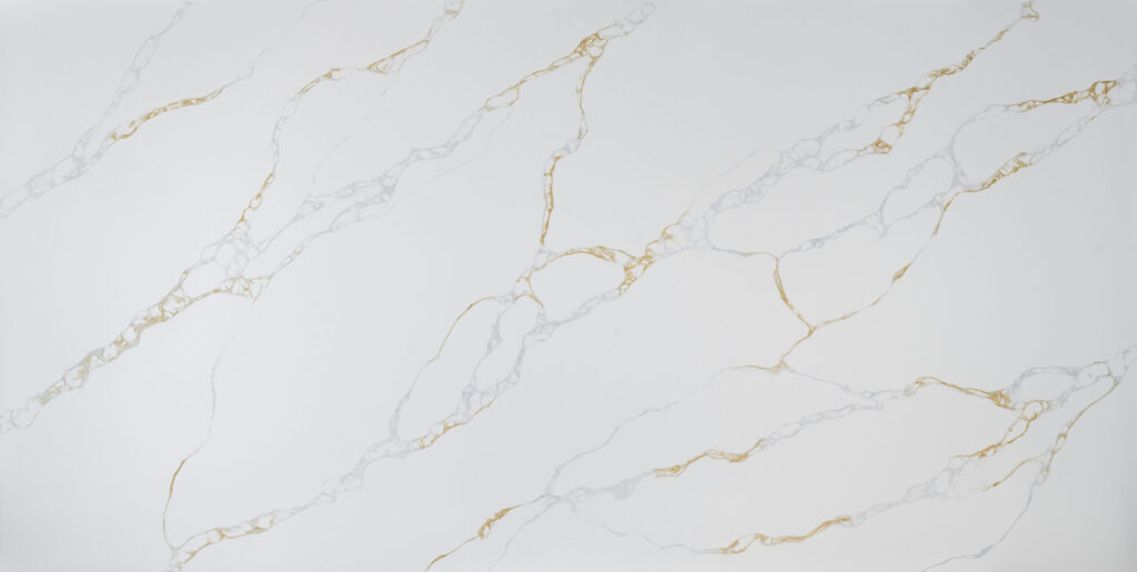 Nuvella features a crisp white backdrop defined by bold, interlacing veins of warm gold and subtle grey. It is an elegant choice for creating a high-end, sophisticated look in any space.