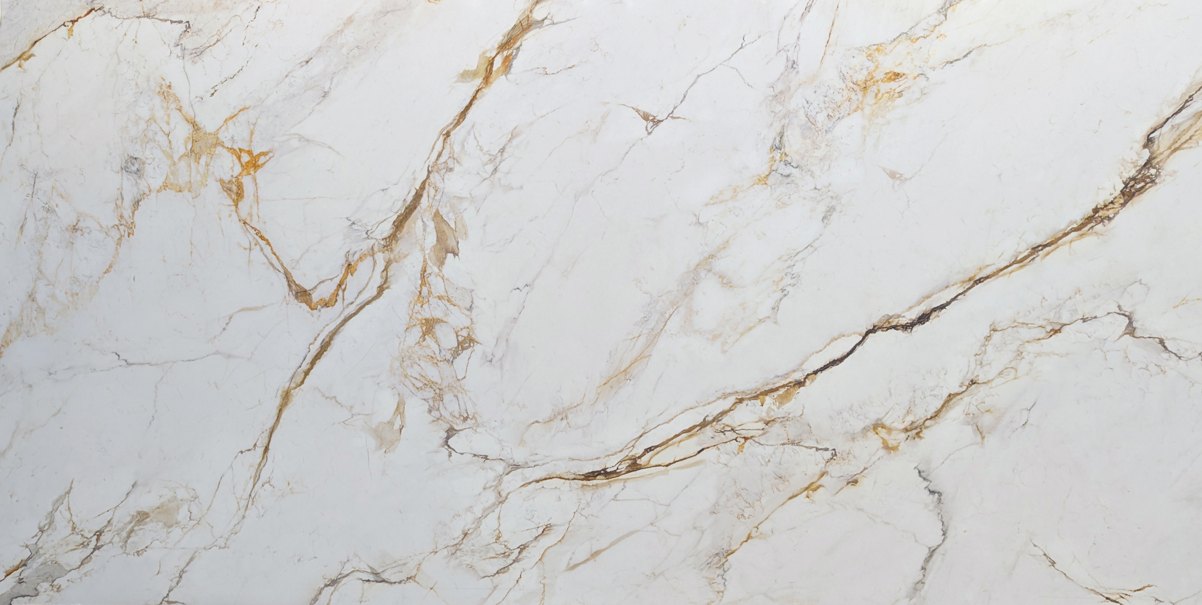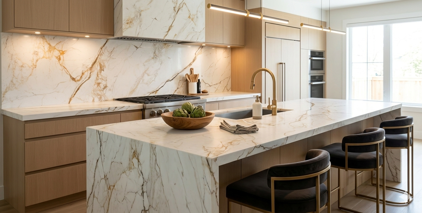 Oro Assoluto features a luminous white backdrop interlaced with dramatic, sweeping veins of warm gold and amber. It is a sophisticated choice for creating high-impact waterfall islands and luxurious focal points.