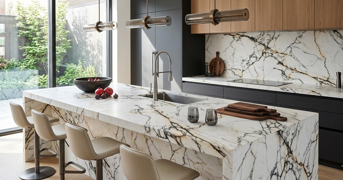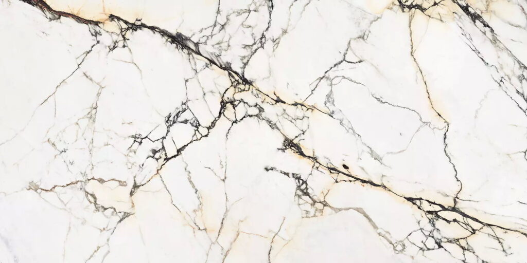 This porcelain slab features a bright, warm ivory base characterized by bold, fractured veining. Its dramatic pattern consists of thick, dark charcoal veins interwoven with distinct amber and honey-colored highlights. The high-contrast, lightning-bolt movements create a prestigious and classical aesthetic, ideal for making a luxury statement in any space.