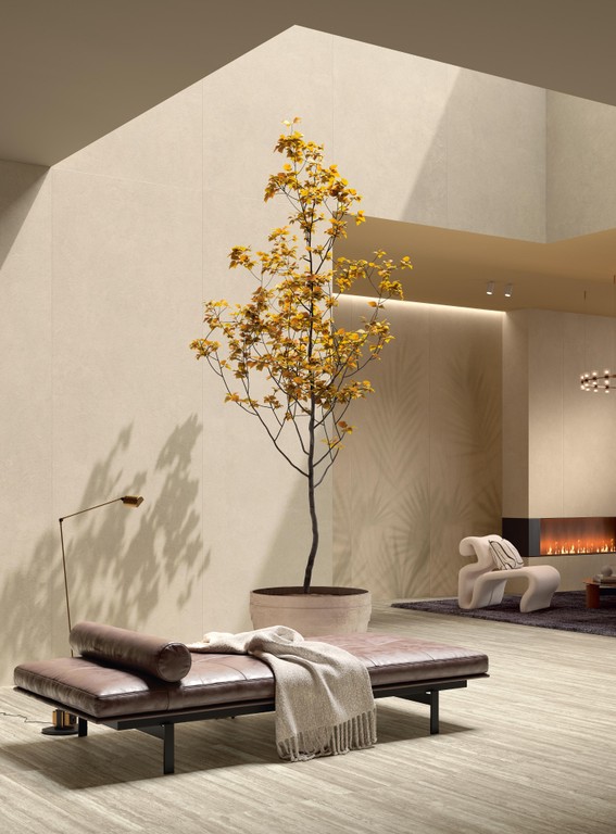 Pelle collection features a rich, toasted ochre tone with a rhythmic, hand-applied plaster texture that creates a warm and inviting surface. Its matte finish and organic, tactile movement offer a sophisticated artisanal quality, perfect for adding a sense of natural depth and craftsmanship to contemporary interiors.