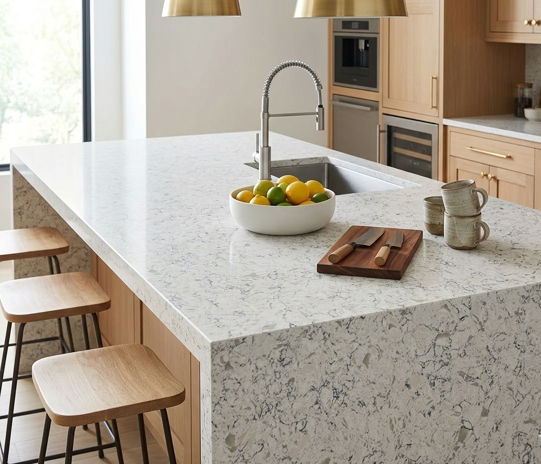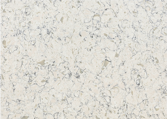 Pluto features a creamy white base characterized by an intricate, web-like pattern of grey veining and larger translucent clusters. This dynamic quartz offers a textured, natural stone look that brings depth and character to any kitchen island or vanity.