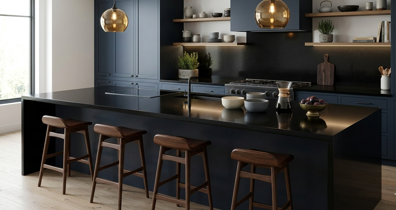 This porcelain slab features a deep, uniform obsidian tone with a refined matte finish. Its consistent dark surface provides a bold, modern foundation for high-end interior designs.