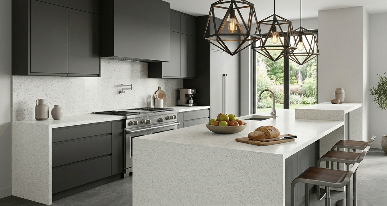 This off-white quartz offers a soft, creamy undertone with a fine, sand-like texture for a warm and inviting feel. It provides a smooth, uniform appearance that works perfectly as a neutral backdrop for any cabinetry style.