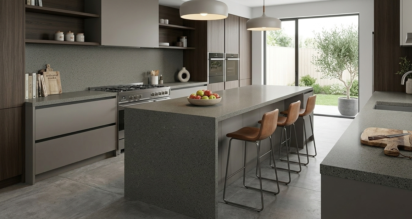 This deep taupe quartz offers a rich, earthy tone with a fine, consistent grain for a sophisticated and grounded look. Its warm, neutral hue makes it a perfect choice for adding depth and contemporary style to any space.