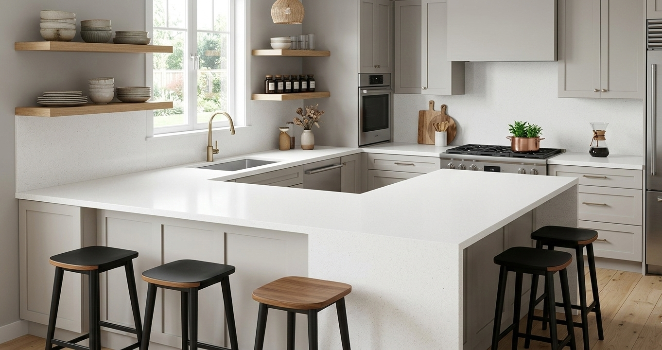 This pure white quartz offers a smooth, ultra-fine texture for a seamless and pristine appearance. Its radiant, solid finish is perfect for achieving a high-end, minimalist look in any kitchen or bath.