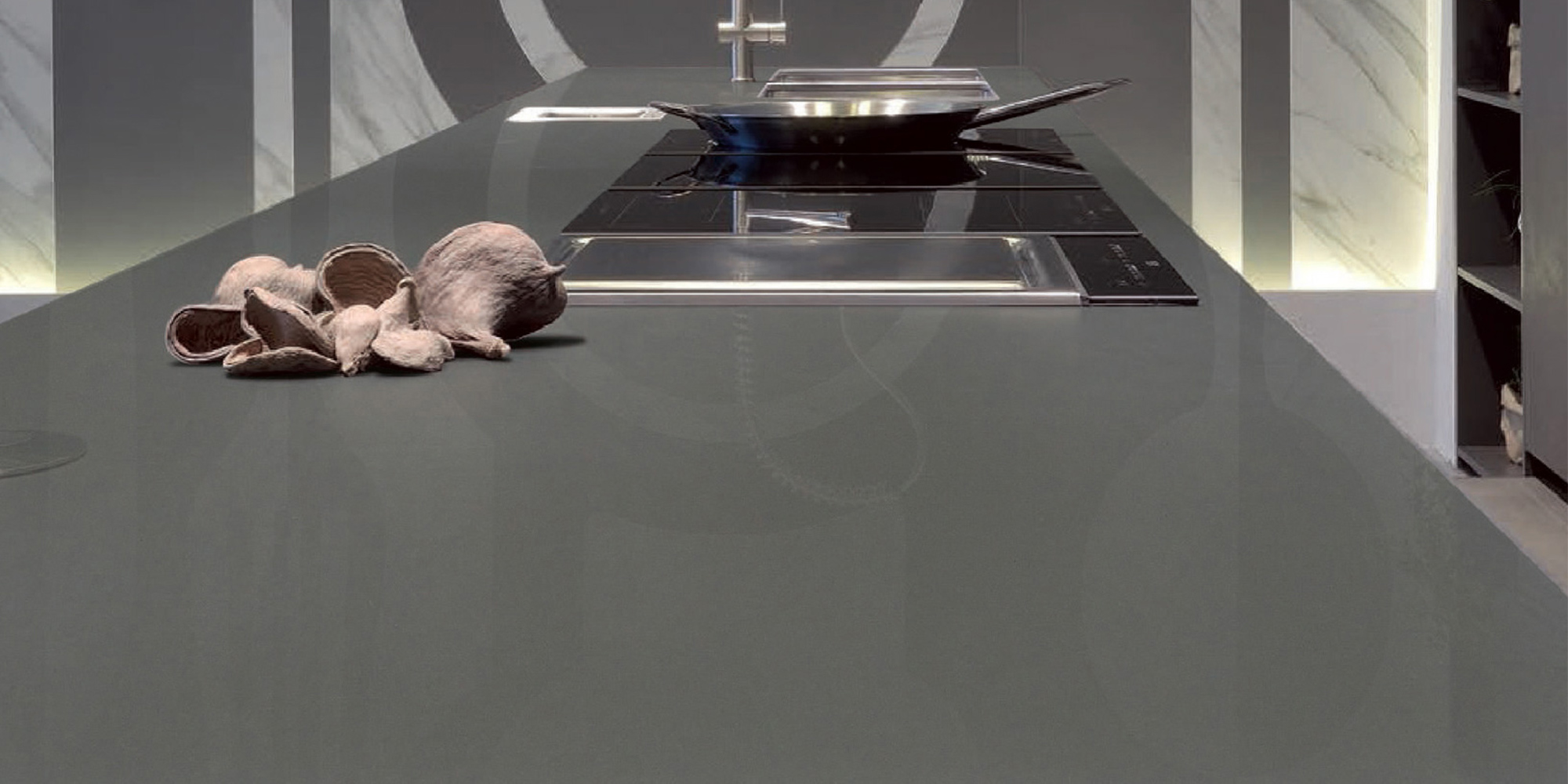 This green-gray quartz provides a solid, monochromatic look that works perfectly for a modern, industrial-inspired space.