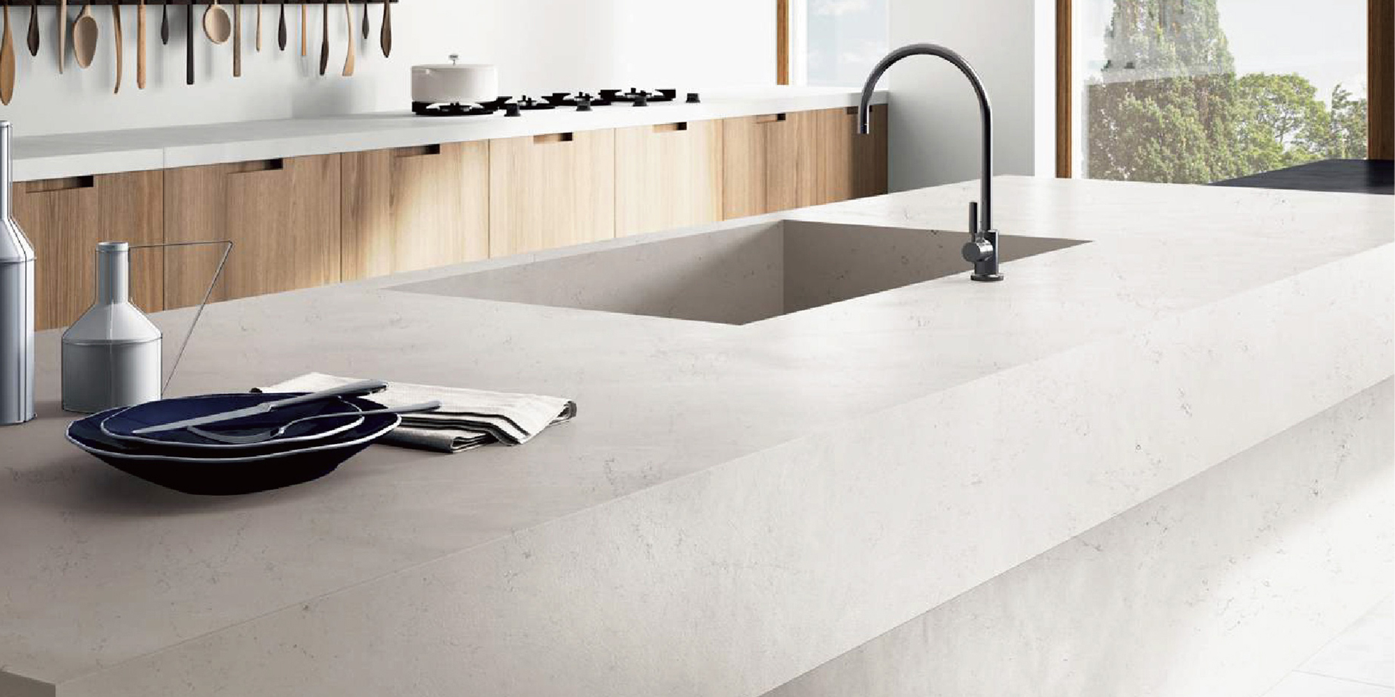 This bright white quartz features delicate, feathered gray veining that is spaced out to create a calm and open feel. The soft, cloud-like patterns offer just enough movement to give the surface a sophisticated, natural look without being distracting.