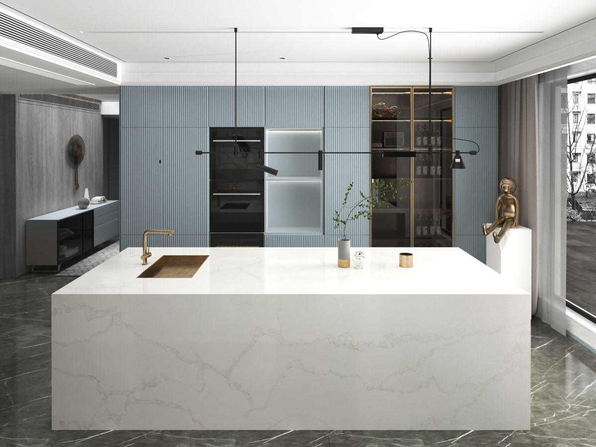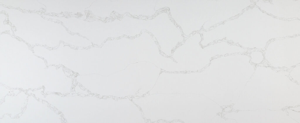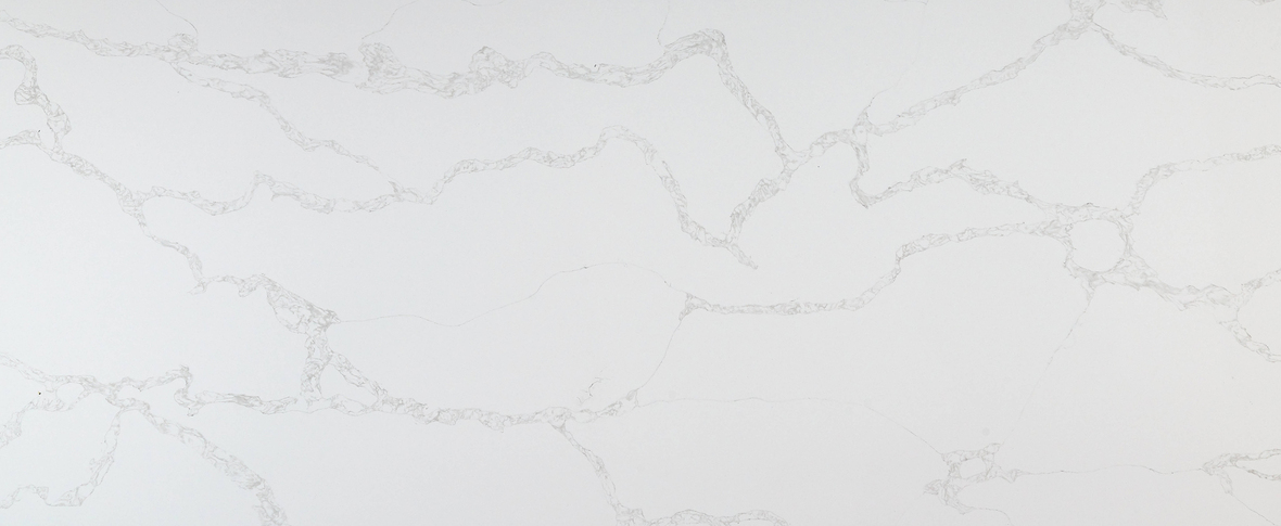 This quartz features a bright white foundation with long, rhythmic gray veins that flow horizontally in a soft, undulating motion. The feathered edges of the veining create a natural, fluid appearance that captures the elegant movement of classic Calacatta marble.