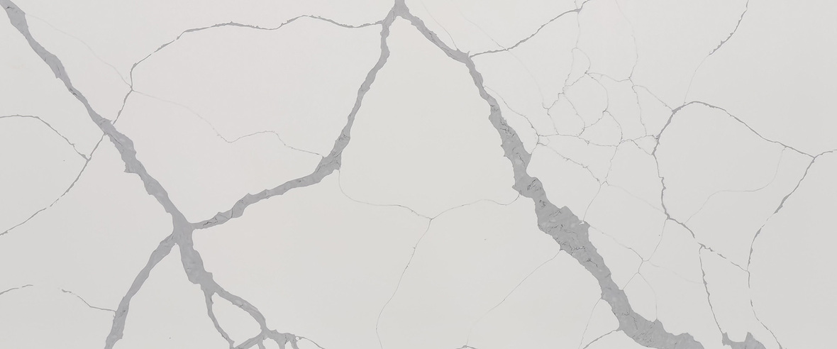 This quartz features a bright white foundation with dramatic, thick gray veins that branch out across the surface like tectonic fractures. The bold, angular movements are balanced by secondary, hairline cracks and soft-edged gray "islands," creating a powerful and high-impact aesthetic reminiscent of classic Italian marble.
