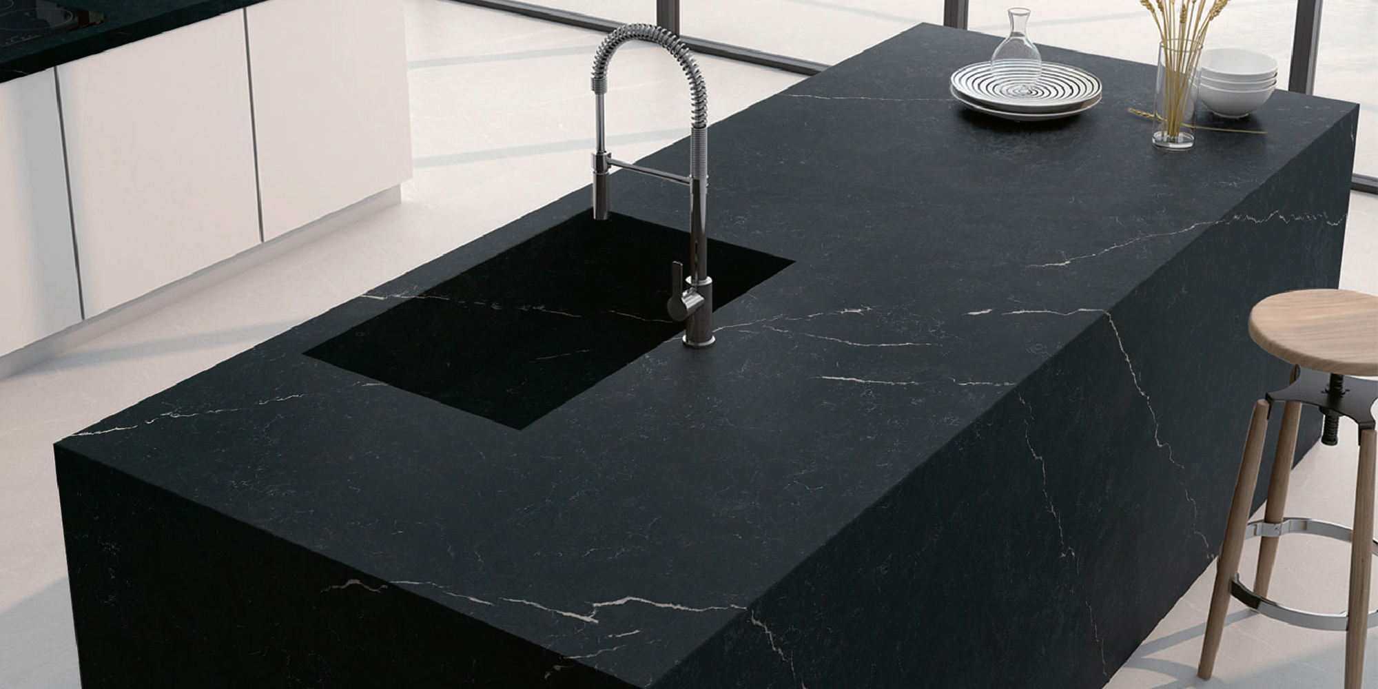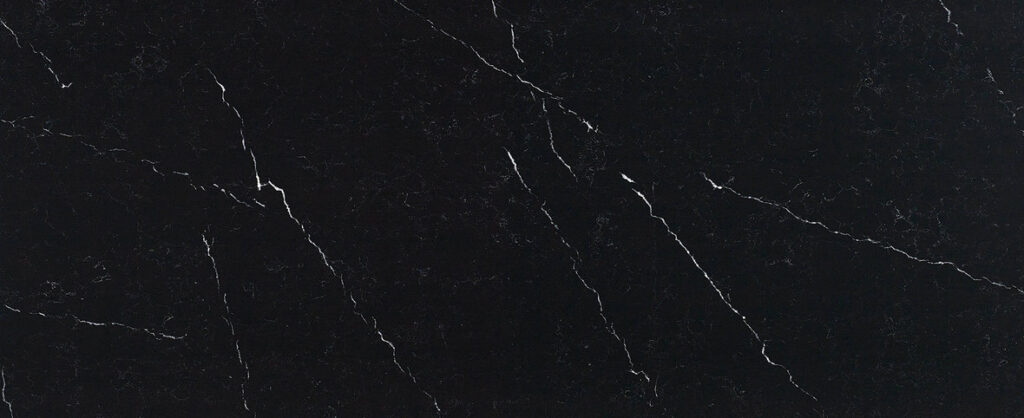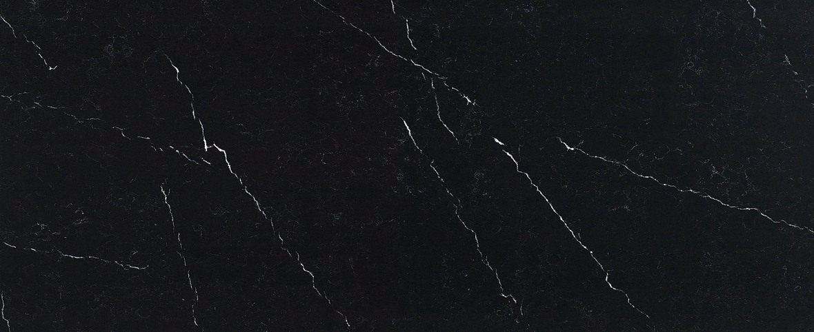 This quartz slab features a deep, solid black background accented by crisp, minimalist white veins that strike across the surface like lightning. Subtle, cloudy charcoal misting adds a layer of depth to the dark base, resulting in a bold, high-contrast look that is both modern and luxurious.