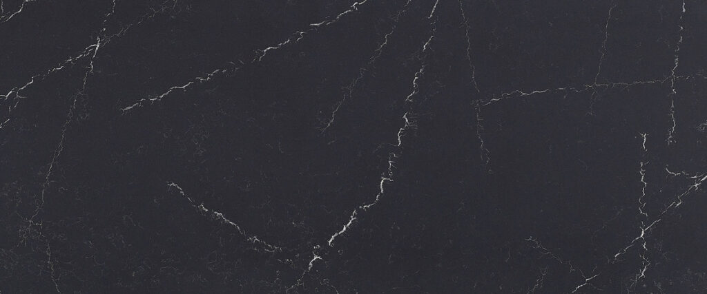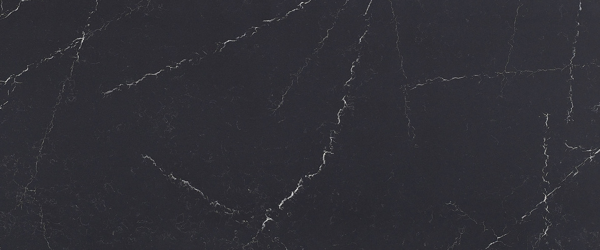 This quartz features a charcoal-black foundation with a soft, matte-like texture. It is detailed with delicate, spindly white veins that branch out in a subtle, web-like fashion. The understated contrast and wispy patterns provide a sophisticated, contemporary look that balances the intensity of the dark base.